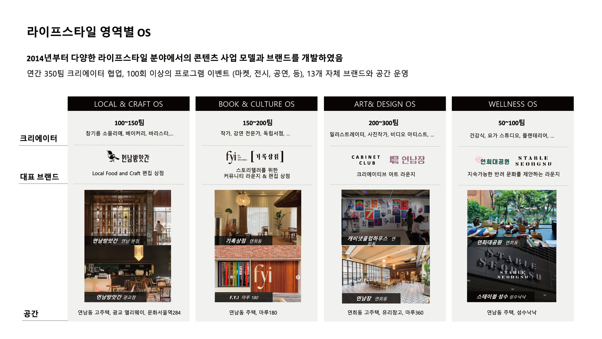 그리고 주어진 공간에 콘텐츠를 순환할 수 있는 다양한 문화 복합형 공간을 개발 운영하는 비즈니스를 주로 하고 있습니다. 직영하고 있는 문화 공간이 25개 정도 됩니다. 저희가 운영하는 공간은 크기가 크지는 않은데, 잠재력과 가능성이 있는 콘텐츠에 지속해서 투자하고 비즈니스화하는 형태로 진행하고 있어요.