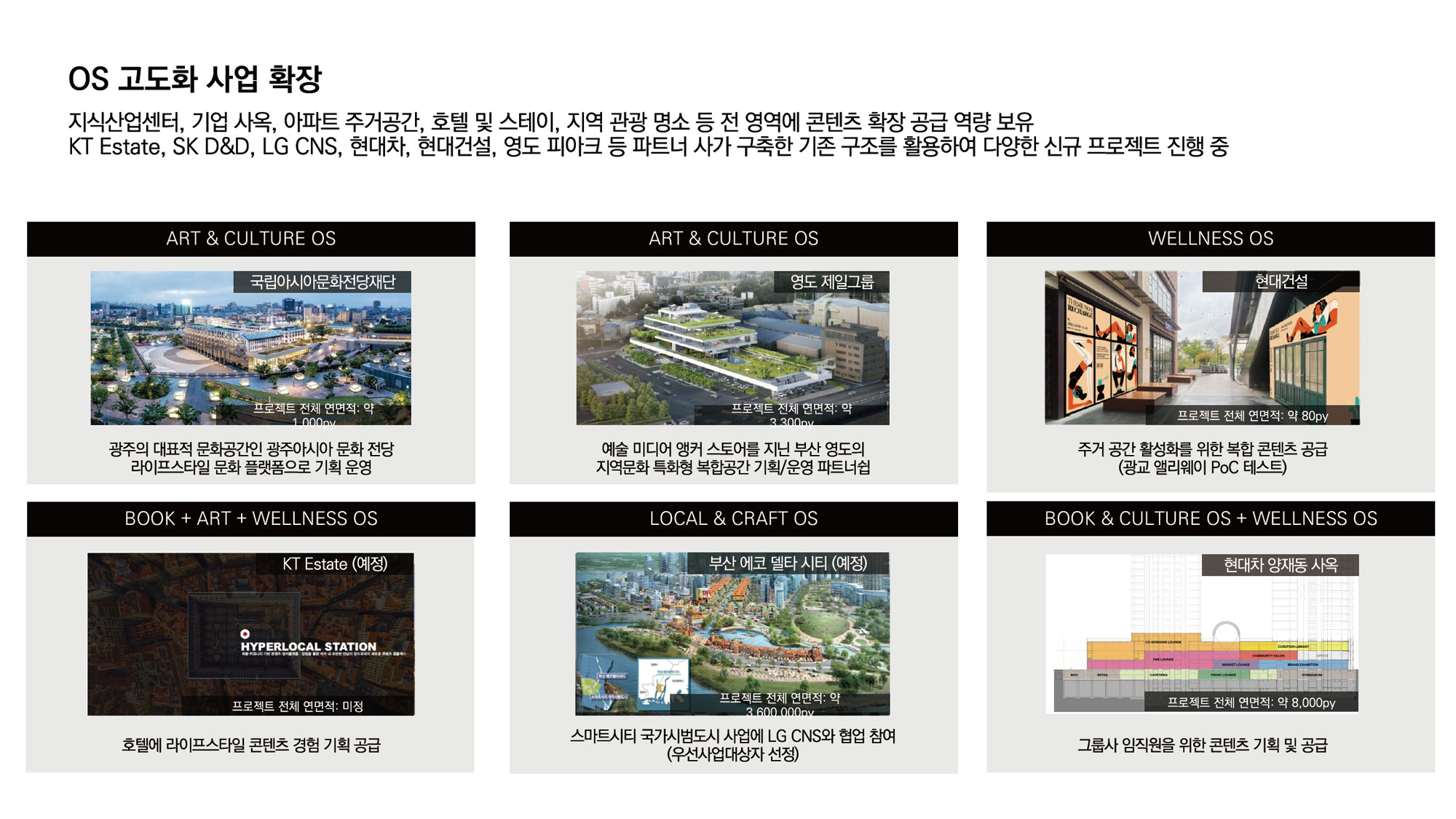 최근 대규모 프로젝트에서도 운영 베이스로 콘텐츠를 기획하고 그걸 기반으로 부동산 프로젝트가 개발되는 사례가 있습니다. 현대자동차 양재동 사옥 프로젝트는 저층부 커뮤니티 시설을 리모델링하면서 콘텐츠 기획부터 그와 관련된 UX 설계까지 저희가 진행합니다. 건축 공간 설계는 디자인 스튜디오와 협업으로 진행하고 있습니다. 부산 영도 피아크 같은 경우는 조선업을 중심으로 하는 지역인 데다 유동인구가 거의 없는 곳이었는데, 조선업 전반이 어려워지면서 이 지역의 가치를 새롭게 발굴해야 하는 시기가 왔습니다. 그래서 저희가 이 공간 개발 프로젝트의 총괄 기획을 맡아서 라이프 스타일 복합 플랫폼으로 공간을 만들었습니다. 다양한 콘텐츠가 이 공간 안에서 펼쳐지게 하려고 공용부를 크게 만들었고 전시, 팝업스토어, 마켓 등이 이루어질 수 있도록 세팅하여 문화 복합형 공간으로서 지역 관광 명소화를 목표로 하는 부동산 개발 프로젝트였습니다. 이처럼 유휴 공간을 활성화하거나 신축 개발 중인 프로젝트, 스테이나 호텔과 같은 콘텐츠가 접목되어야 하는 서비스 공간 기획도 하고 있습니다.