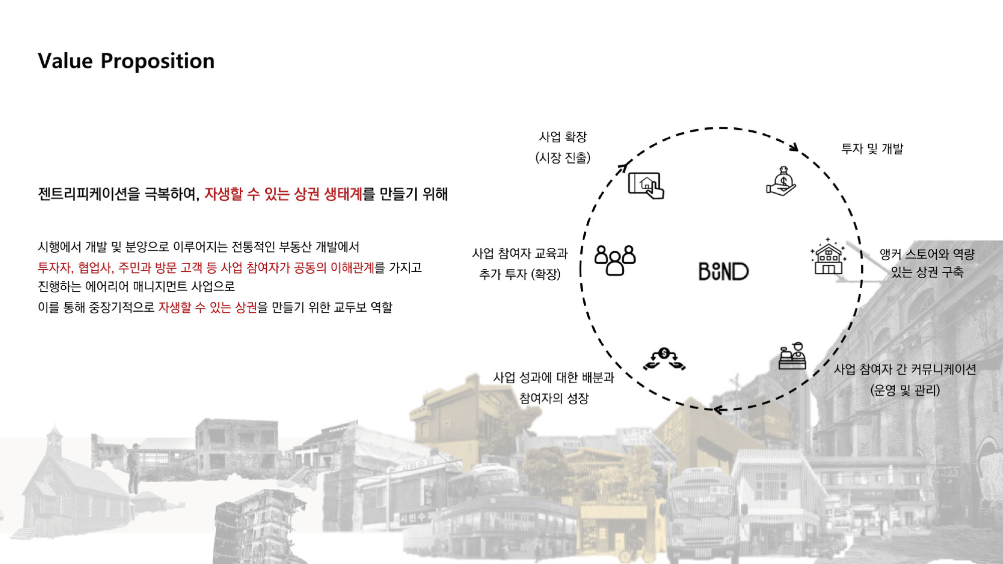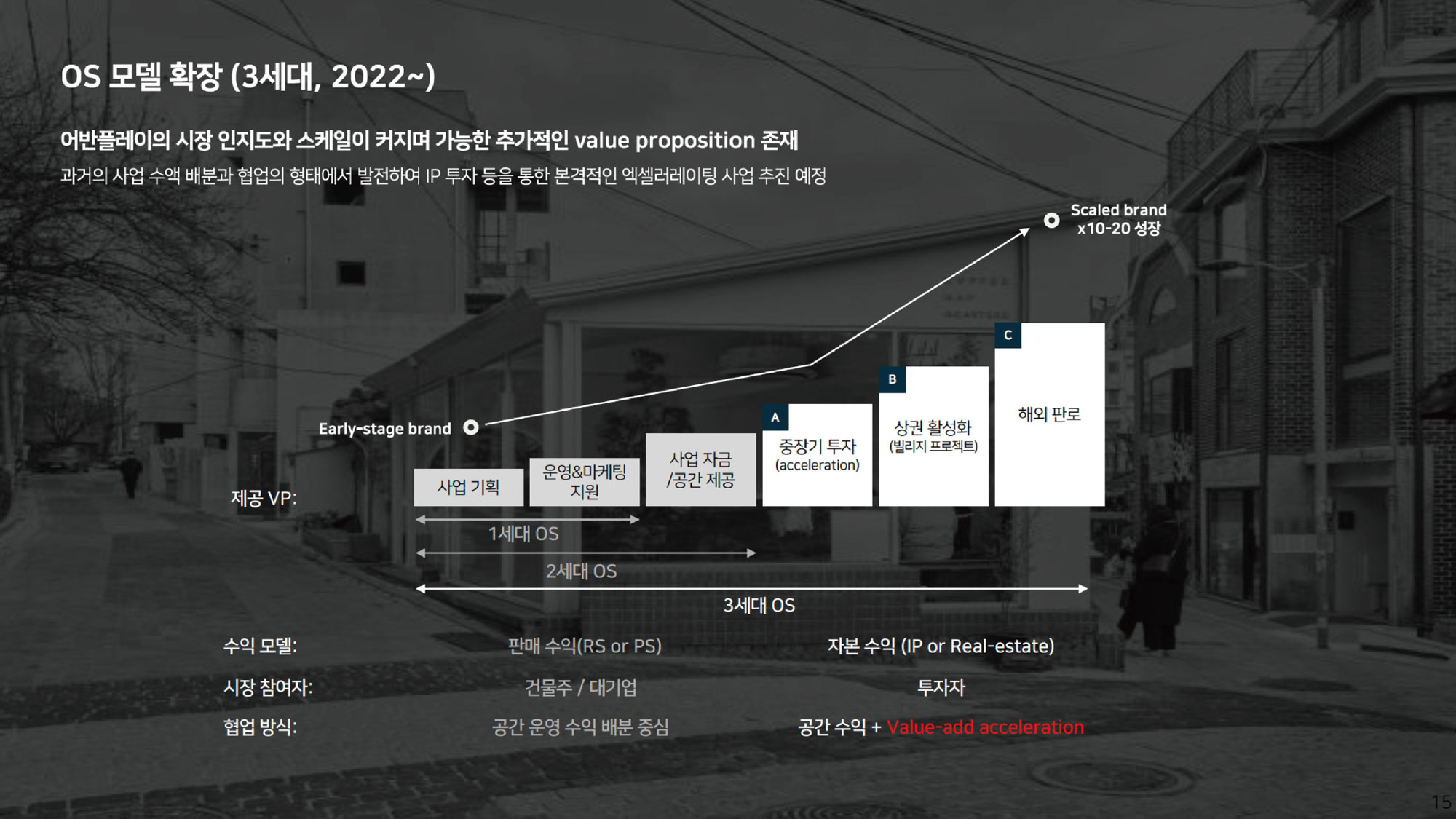 그동안 OS 모델을 통해서 문화복합형 공간을 주로 만들어왔다면, 최근에는 중장기적인 콘텐츠에 투자하고, 상권 활성화를 위해 동네 단위로 기획, 운영하며, 좋은 콘텐츠를 해외에 진출시키는 방향으로 사업을 확장해 나가고 있습니다. 가장 대표적으로 연남동과 연희동을 중심으로 동네 매니지먼트 서비스 바운드 프로젝트를 진행하고 있습니다. 건물주의 투자자, 소비자, 크리에이터를 연결하는 일을 중심으로, 하이퍼로컬 타운 개념으로 다양한 형태의 콘텐츠를 제공하는 동네를 기획하고 운영하는 방식입니다. 그리고 크리에이터의 비즈니스를 실험할 수 있는 공간을 만들고 있습니다. 단순히 공간을 개발하는 프로젝트가 아니라 ‘연희, 걷다’ 같은 지역의 축제, 지역 아카이빙 작업과 같이 실제 커뮤니티 안에서 이루어져야 하는 다양한 서비스를 민간 영역에서 시도하고 있는 프로젝트입니다. 그리고 이러한 노하우를 토대로 제주, 수원 그 외의 지역까지도 확장해 나가고 있고, 해외 진출도 준비하고 있습니다. 이제는 디지털 기술을 활용해서 소비자가 우리의 콘텐츠와 서비스를 더 효율적으로 이용하는 방법을 많이 고민하고 있고, 디지털 전략을 세워서 바운더리라는 서비스를 개발하고 있습니다. (8월에 정식 오픈 예정입니다.)