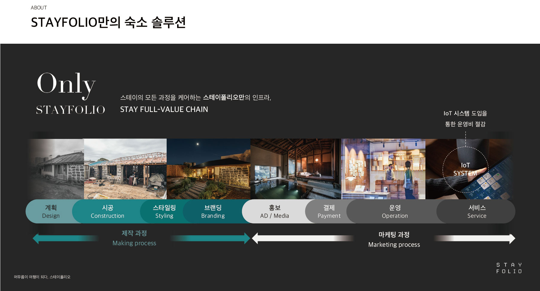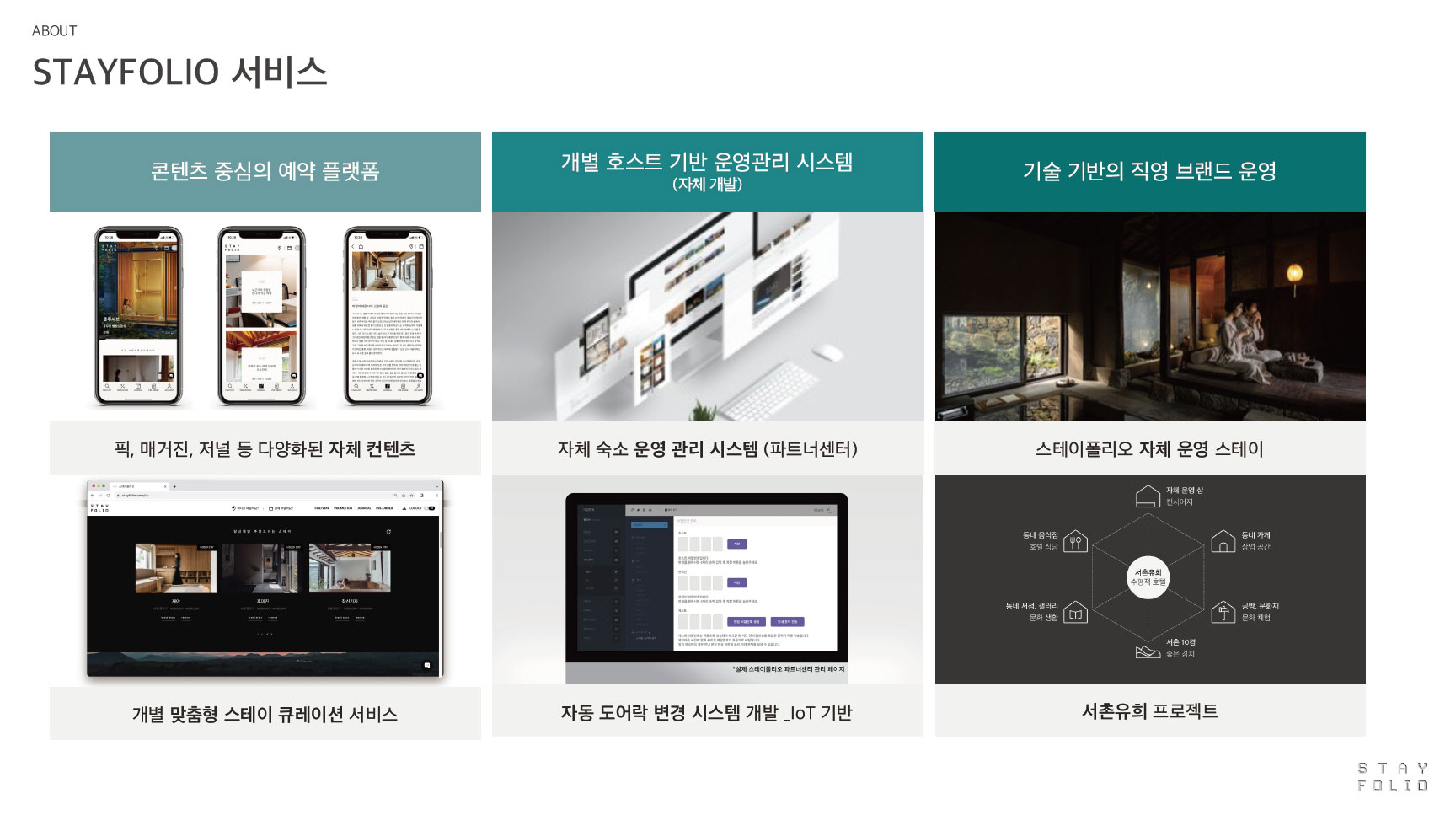 스테이폴리오는 쉽게 생각하면 하나의 집 또는 방을 경험할 수 있도록 서비스를 제공하는 플랫폼 비즈니스입니다. 스테이폴리오에 입점한 스테이가 숙박비를 받으면, 소유주에게는 청소 등에 들어가는 관리비를 제외한 이윤이 생기는 한편, 스테이가 잘 조성, 운영되어서 가치가 발생하면 그 동네가 혁신하면서 가치가 또 오릅니다. 이런 관점에서 비즈니스 구조가 만들어집니다. 또, 저희 이름이 ‘스테이 포트폴리오’라는 뜻인데, 프랜차이즈 개념이 아니라 개별 스테이를 집합시킨 개념이기 때문에 호텔 하나의 500실보다 500채의 스테이를 모아둔 것이 훨씬 더 다채롭고 강력하다고 생각했습니다. 이런 부분을 생각하는 것은 창의성의 영역일 수 있겠죠. 이처럼 두 영역의 감각을 지속적으로 균형잡으면서 지금까지 해왔습니다.