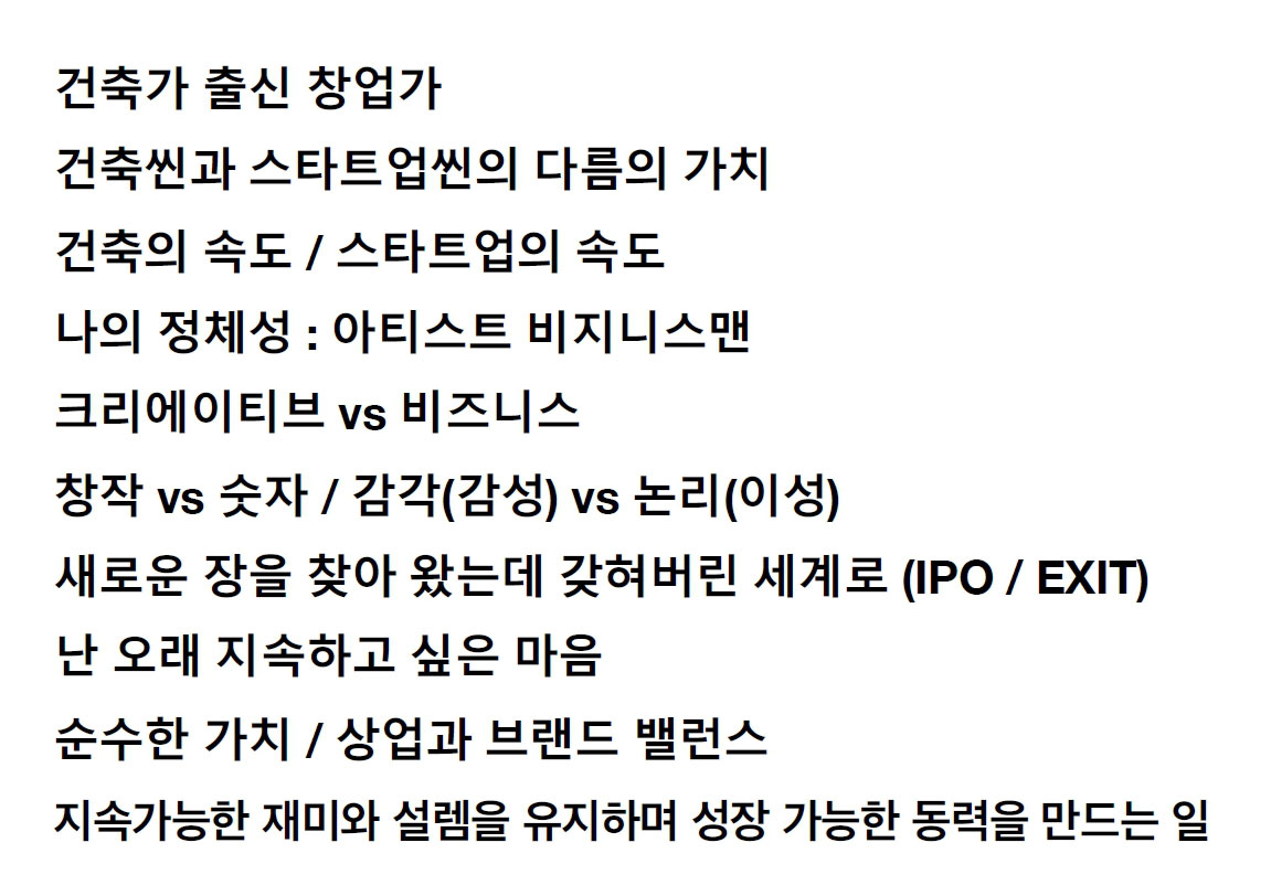 그러다 보니까 저는 분명히 새로운 장을 열기 위해서 사업의 길로 접어들었는데, 열린 게 아니라 완전히 갇힌 세계에 있더라고요. 우리가 투자를 받으면, 투자자에게 투자금을 돌려줘야 합니다. 그러니까 IPO(기업 공개)와 엑시트(투자 후 출구전략)를 인지하고 있어야 하죠. 저는 이렇게 재미있는 일, 설레는 일을 지속 가능하게 만들고 오래하고 싶기 때문에 투자받고 비즈니스 모델도 만들고 아티스트와 비즈니스맨 사이에서 균형을 잡아야 해요. 그러니까 그 순수한 가치와 상업과 브랜드 사이의 밸런스를 어떻게 이룰 것인가가 가장 큰 숙제입니다. 누가 가르쳐준 적도 없고 매일매일 도전하고 있는데, 요즘 여러 가지 고민이 많습니다. 청중 여러분 중에서도 건축사사무소 창업이나 (오늘 참석한 패널처럼) 건축의 경계를 벗어난 창업을 준비하는 분도 있을 텐데, 이러한 밸런스 게임은 사업을 이어 나가는 데 있어서 굉장히 중요하다는 점을 말씀드리고 싶습니다.