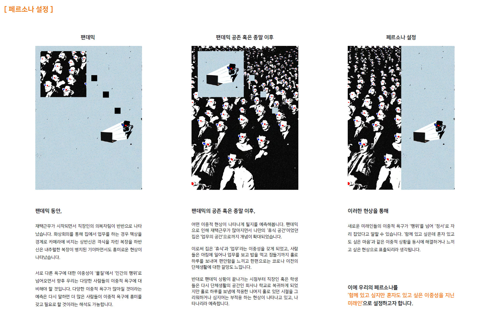 이러한 현상을 통해 새로운 미래인들의 이중적 욕구가 ‘행위’를 넘어 ‘정서’로 자리 잡았다고 말할 수 있습니다. ‘함께 있고 싶은데 혼자 있고도 싶은 마음’과 같은 이중적 상황을 동시에 해결하거나 느끼고 싶은 현상으로 표출되리라 생각됩니다. 이에 우리의 페르소나를 ‘함께 있고 싶지만 혼자도 있고 싶은 이중성을 지닌 미래인’으로 설정하고자 합니다.