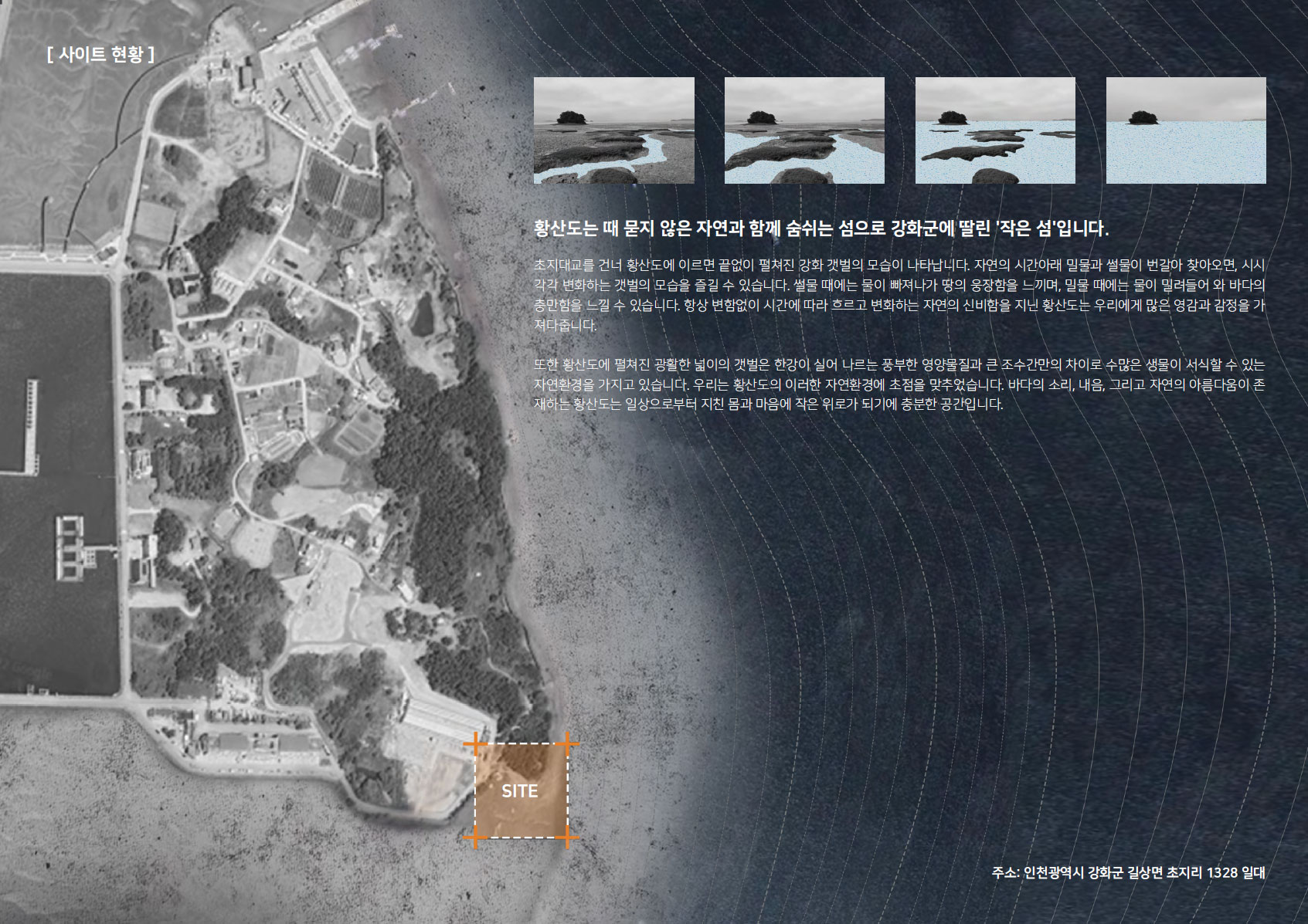 또한 황산도에 펼쳐진 광활한 넓이의 갯벌은 한강이 실어 나르는 풍부한 영양물질과 큰 조수간만의 차이로 수많은 생물이 서식할 수 있는 자연환경을 가지고 있습니다. 우리는 황산도의 이러한 자연환경에 초점을 맞추었습니다. 바다의 소리, 내음, 그리고 자연의 아름다움이 존재하는 황산도는 일상으로부터 지친 몸과 마음에 작은 위로가 되기에 충분한 공간입니다.