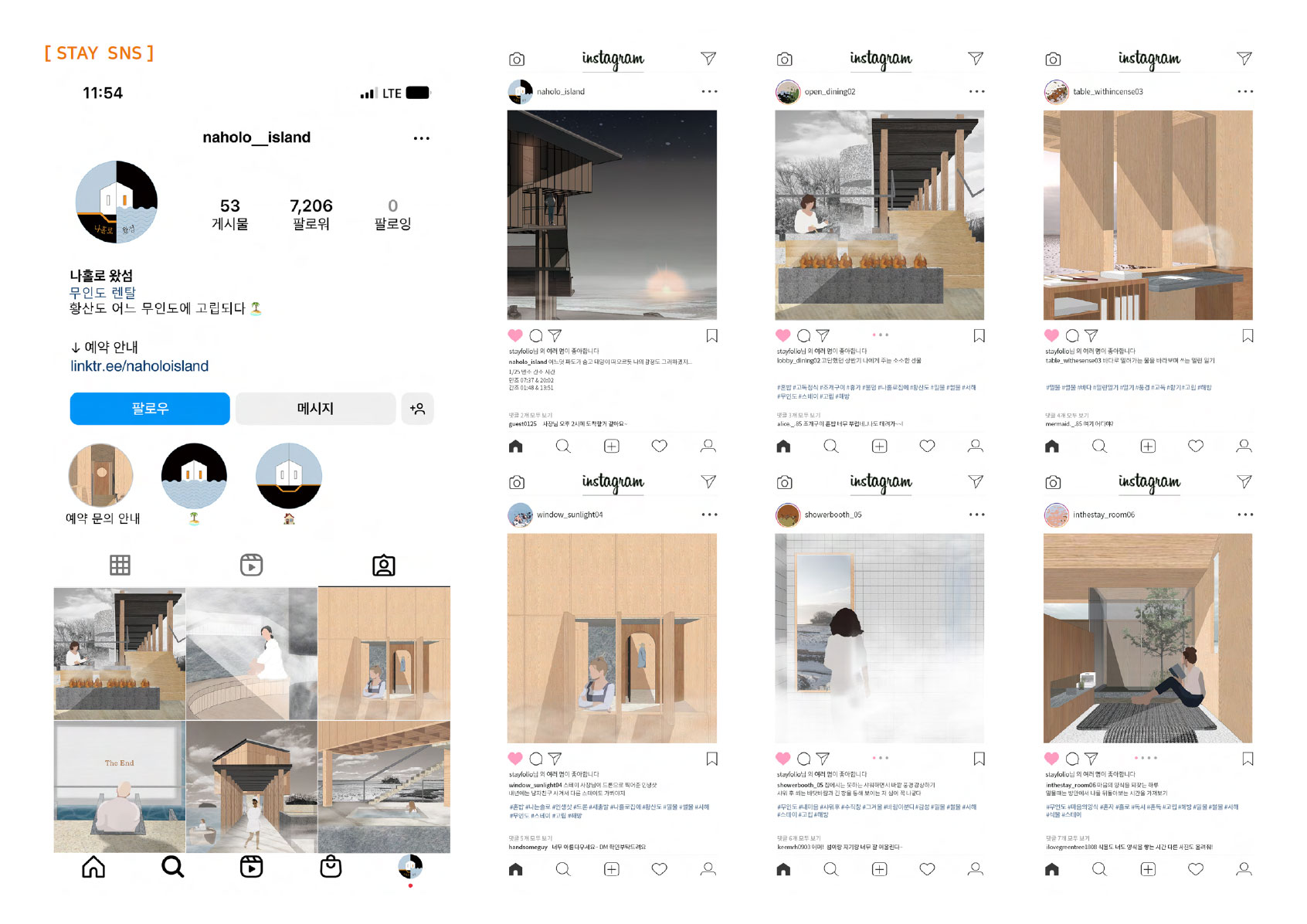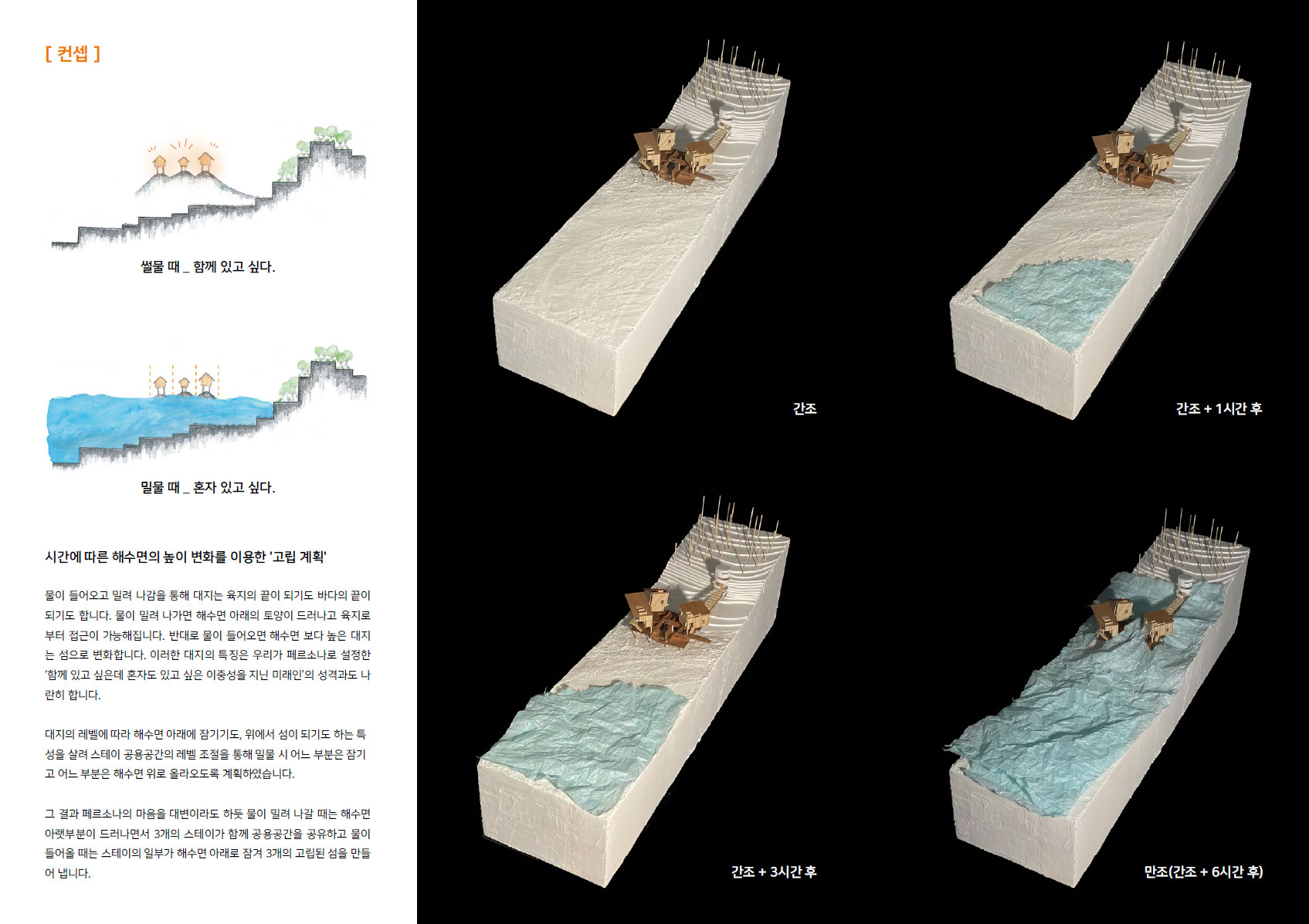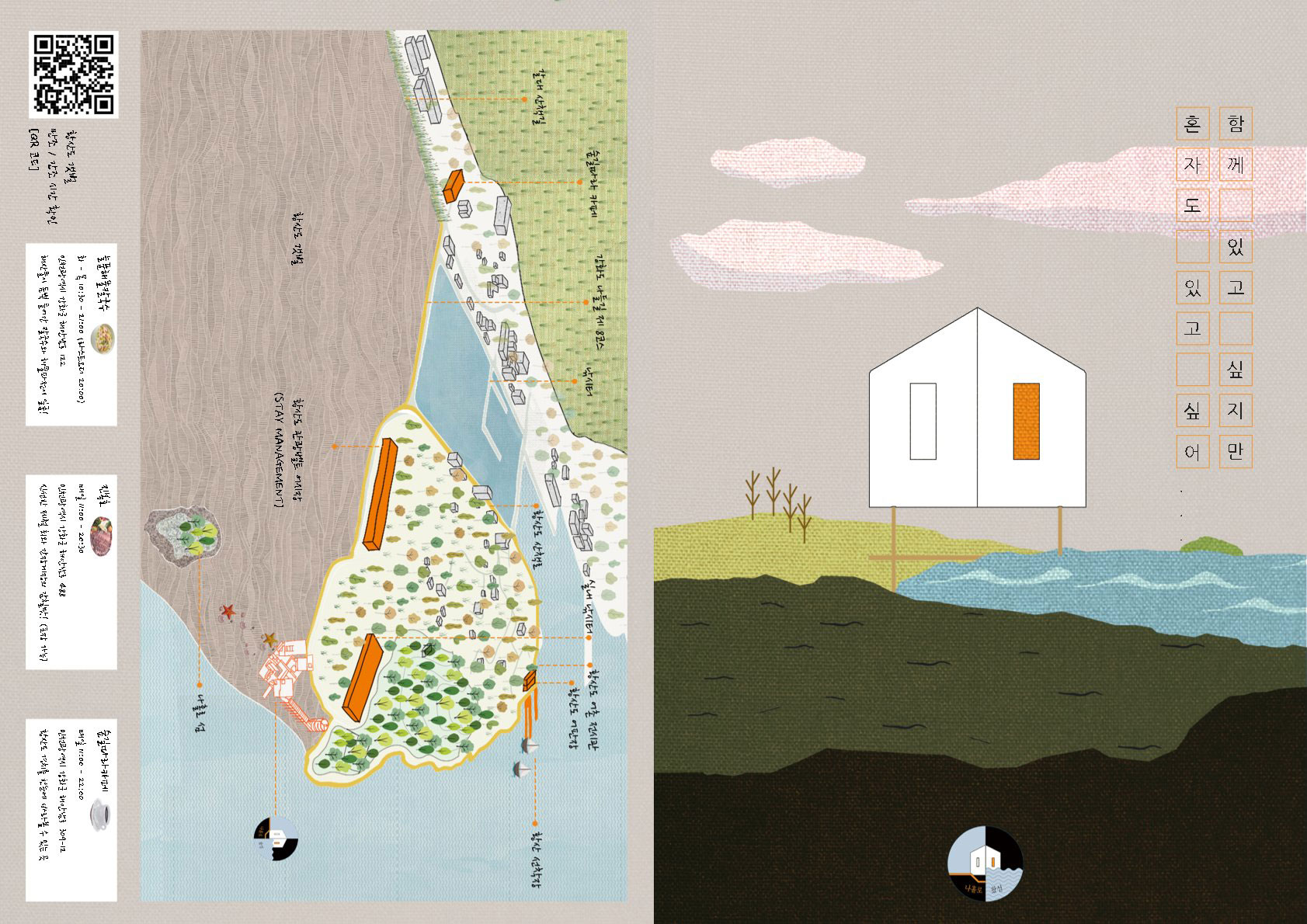 여행지로 사람들의 이중적인 마음을 대변할 수 있는 ‘황산도 갯벌’을 선택하였다. 갯벌의 특성인 밀물과 썰물에 따라 스테이의 물리적 환경이 변화하며, 함께하는 공간이 되기도, 혼자만의 공간이 되기도 한다. 시시각각 변화하는 사람들의 모습 같은 ‘나홀로 왔섬’, 나와 닮은 스테이에서 여행을 즐기길 바란다.