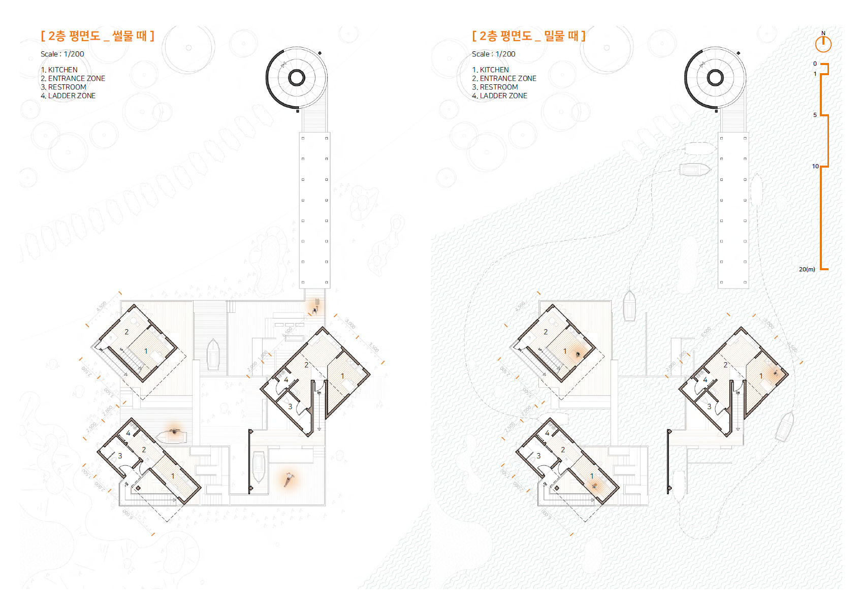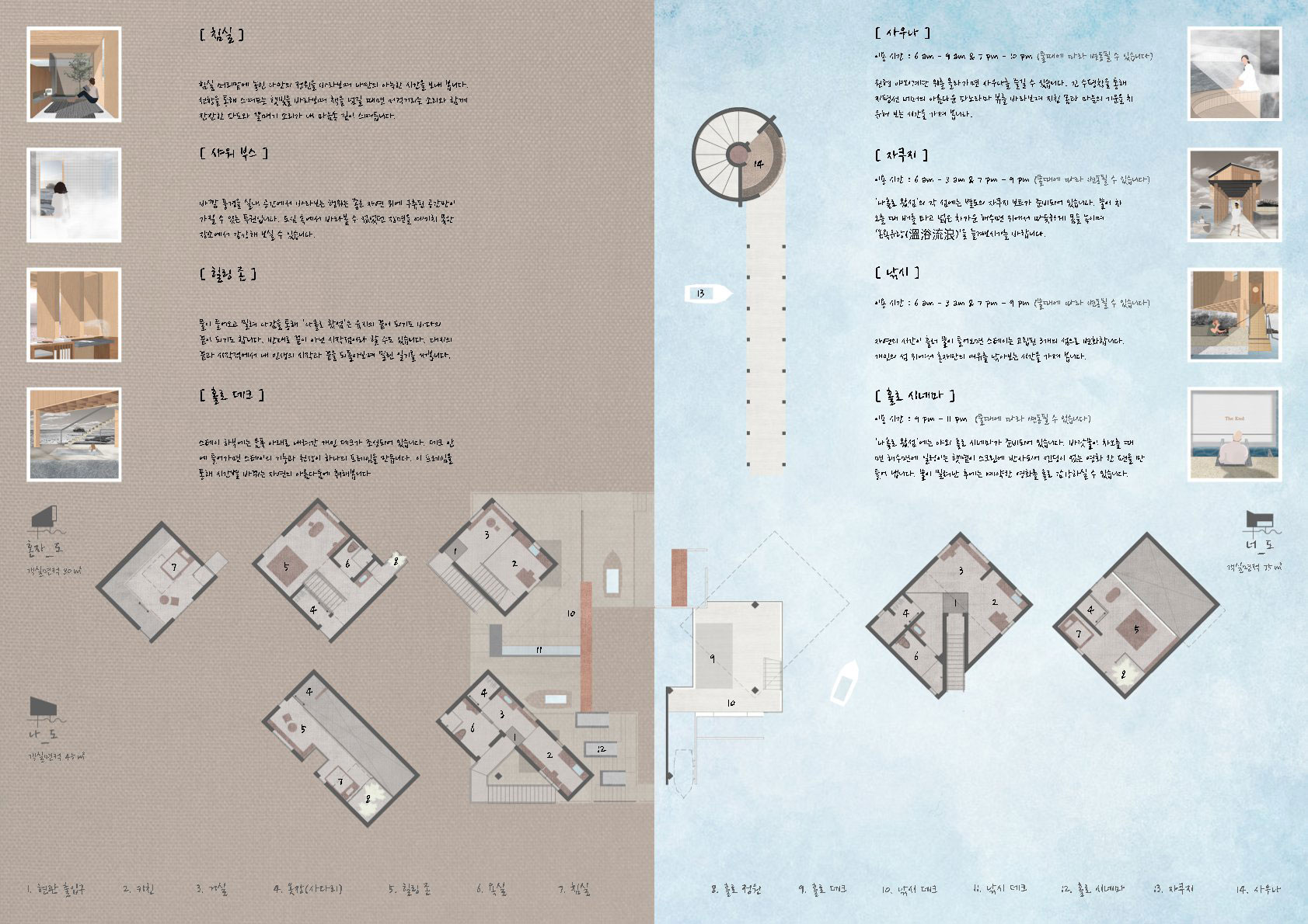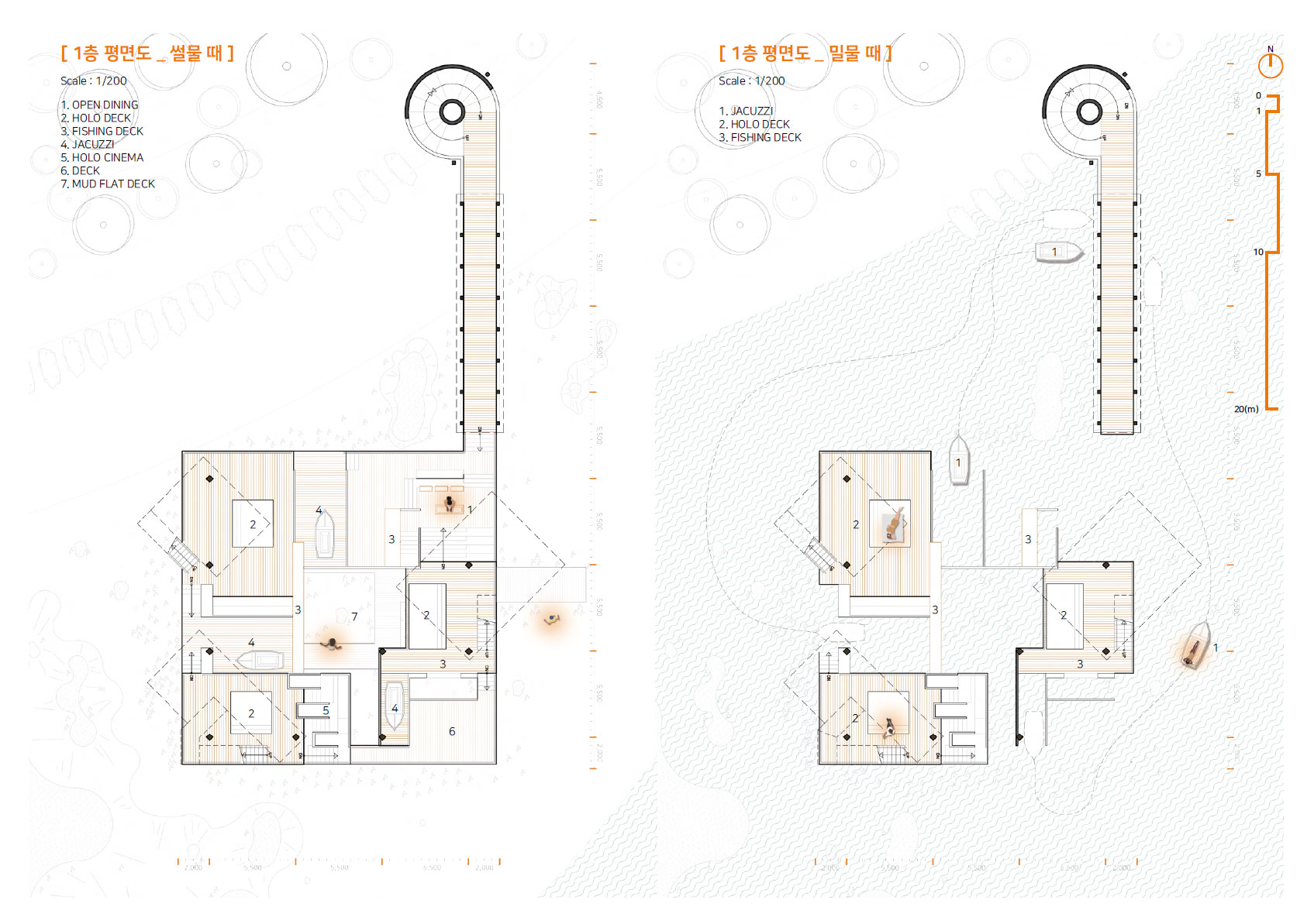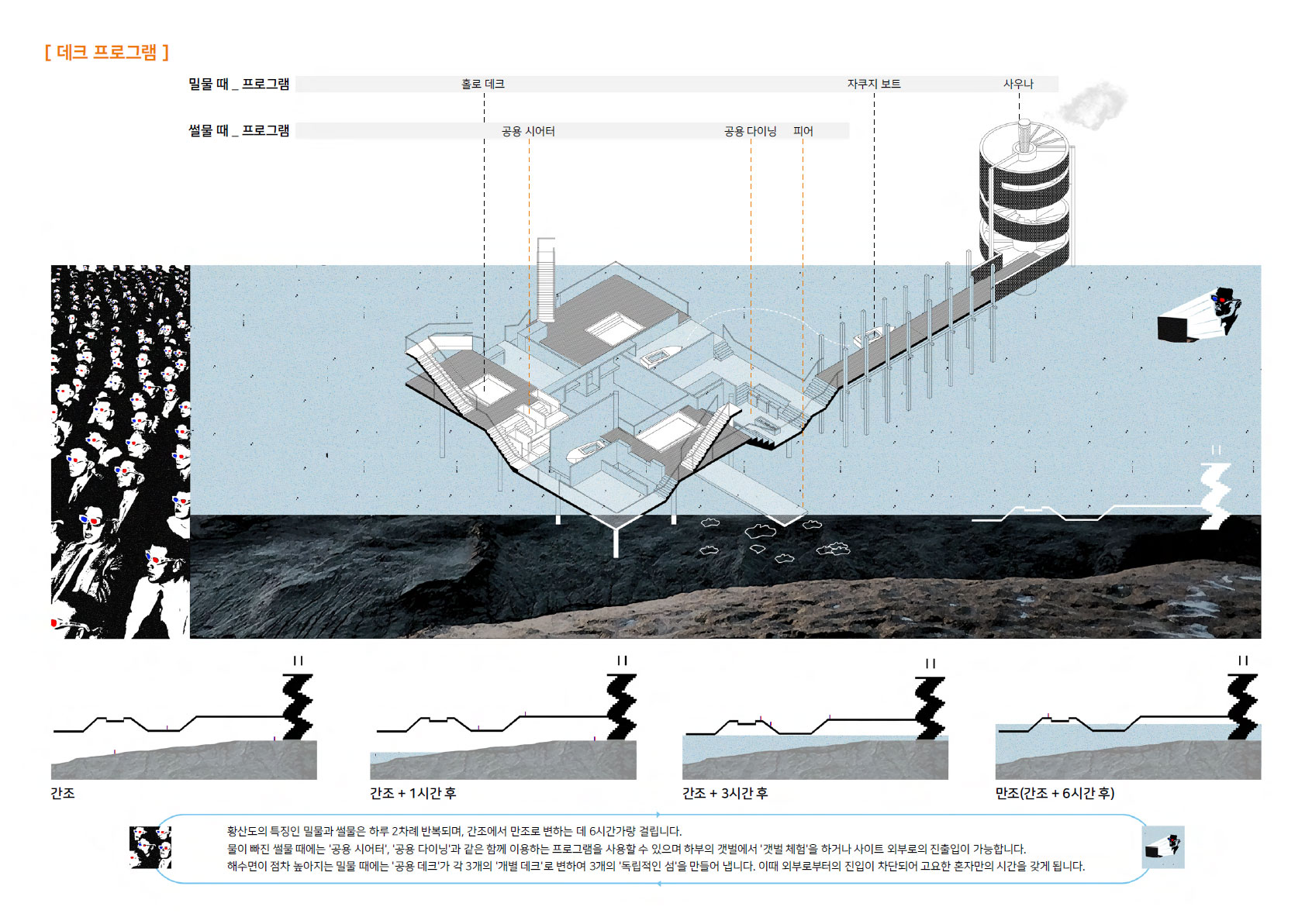 나홀로 왔섬 공간적으로는 밀물 때와 썰물 때의 프로그램을 크게 나누고자 했다. 그래서 썰물 때는 데크가 공용 공간으로 3개의 객실에 투숙하는 투숙객들이 자유롭게 돌아다니며 사용할 수 있지만, 밀물 때는 데크의 일부가 물에 잠기며 각각의 객실이 마치 무인도 위의 독채처럼 고립되는 것을 의도했다.