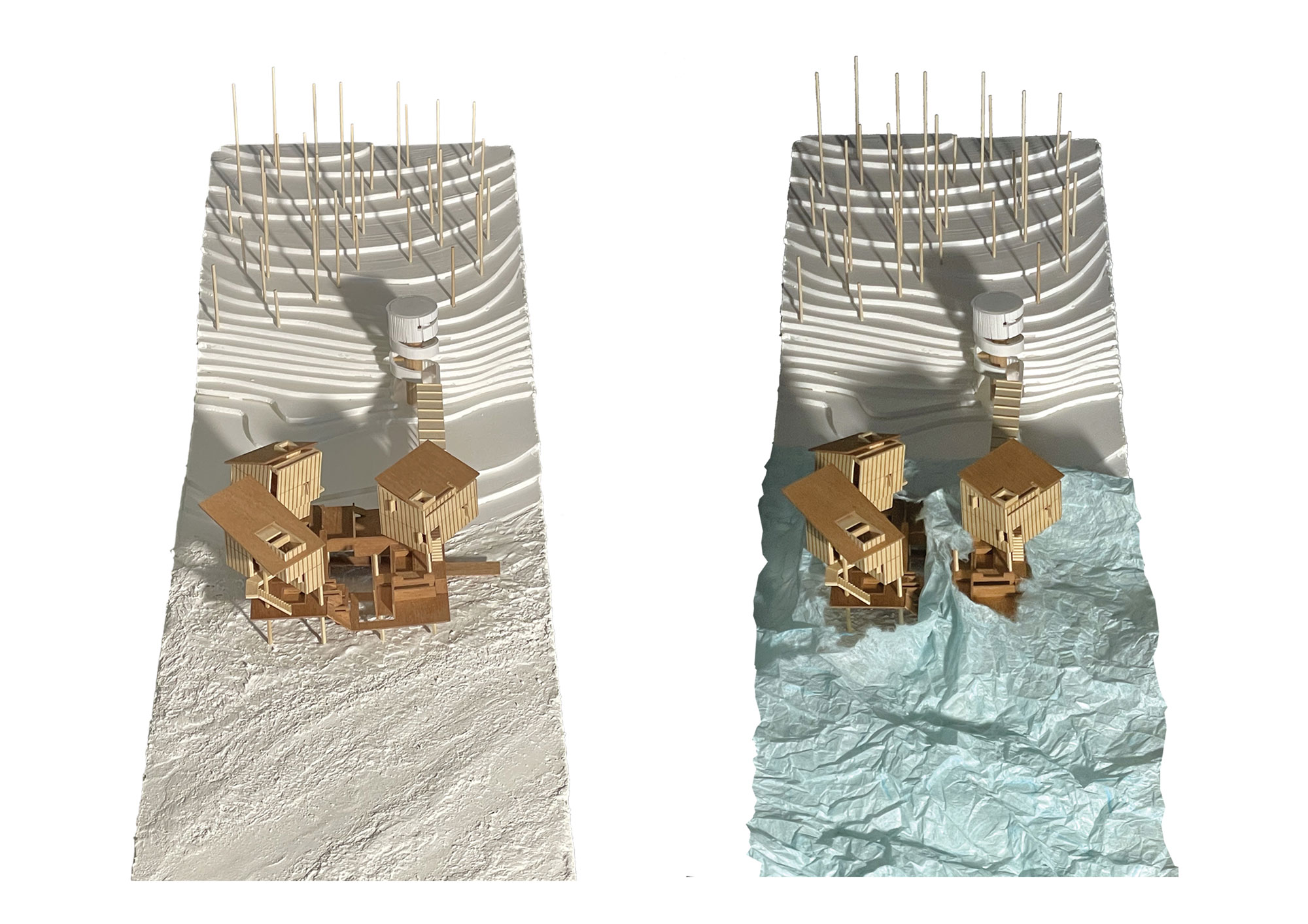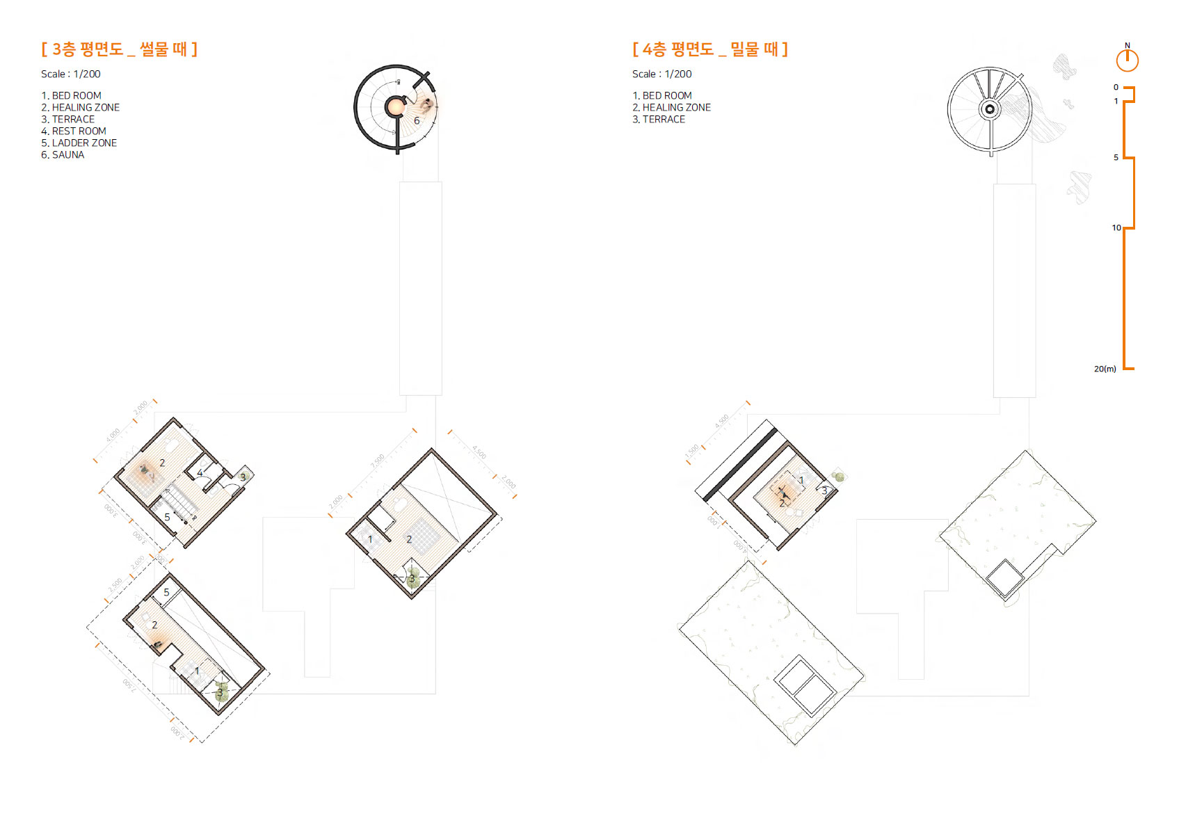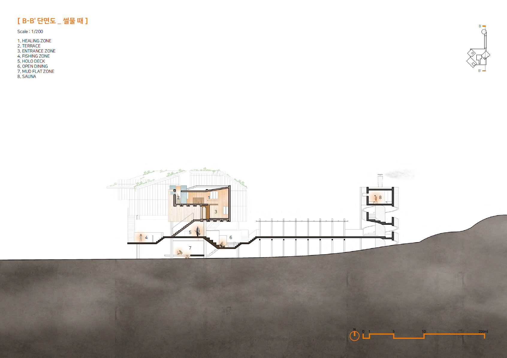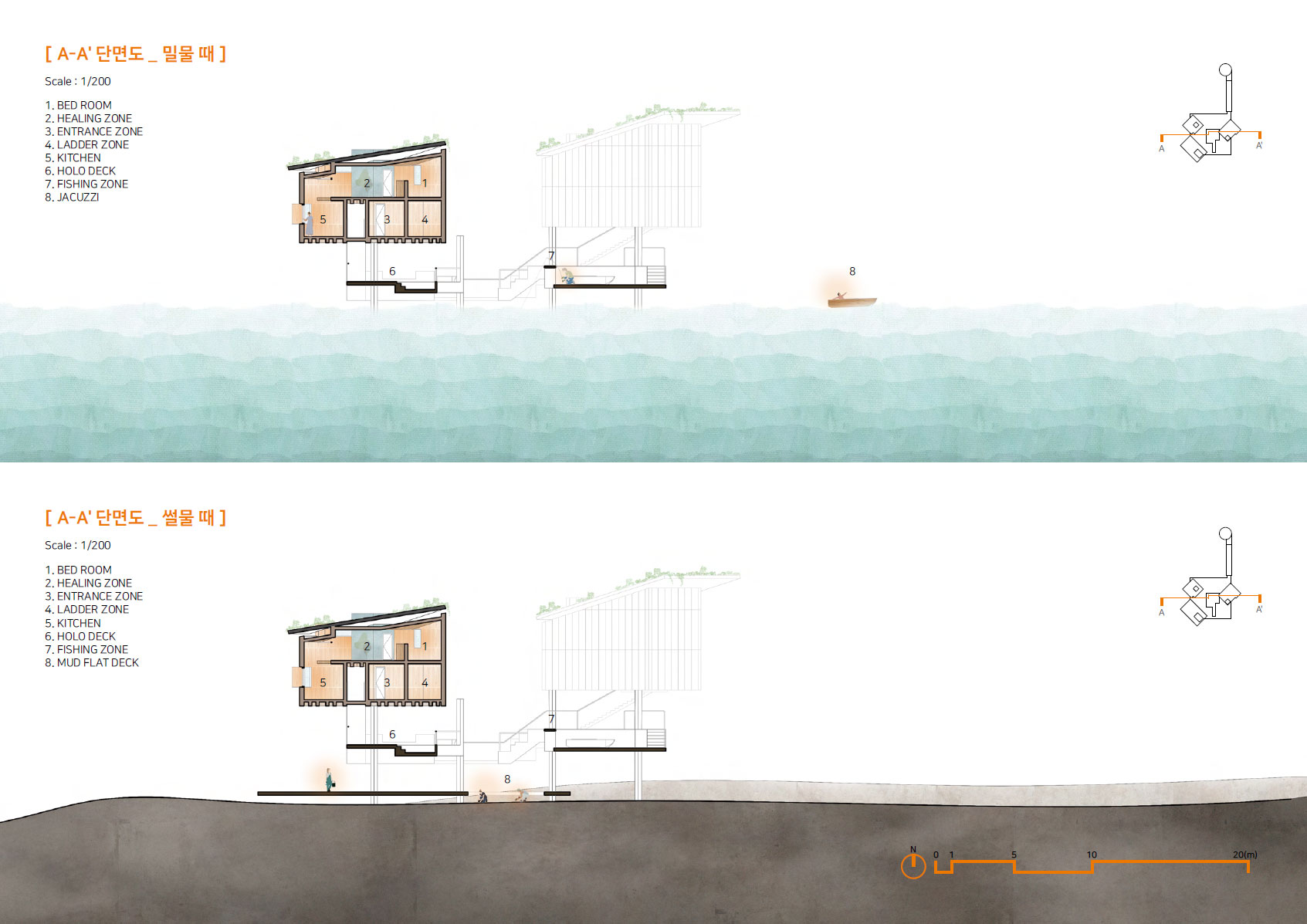 나홀로 왔섬 공간적으로는 밀물 때와 썰물 때의 프로그램을 크게 나누고자 했다. 그래서 썰물 때는 데크가 공용 공간으로 3개의 객실에 투숙하는 투숙객들이 자유롭게 돌아다니며 사용할 수 있지만, 밀물 때는 데크의 일부가 물에 잠기며 각각의 객실이 마치 무인도 위의 독채처럼 고립되는 것을 의도했다.