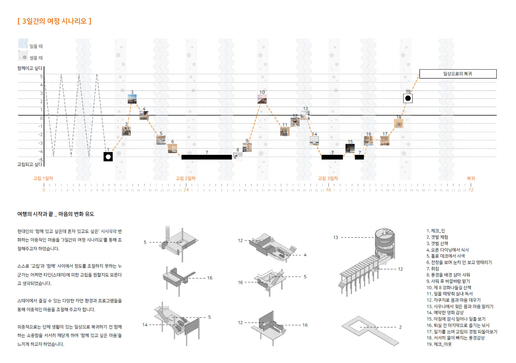 현대인의 ‘함께 있고 싶은데 혼자 있고도 싶은’ 시시각각 변화하는 이중적인 마음을 ‘3일간의 여정 시나리오’를 통해 조절해주고자 하였습니다. 스스로 ‘고립’과 ‘함께’ 사이에서 정도를 조절하지 못하는 누군가는 어쩌면 타인(스테이)에 의한 고립을 원할지도 모른다고 생각되었습니다.