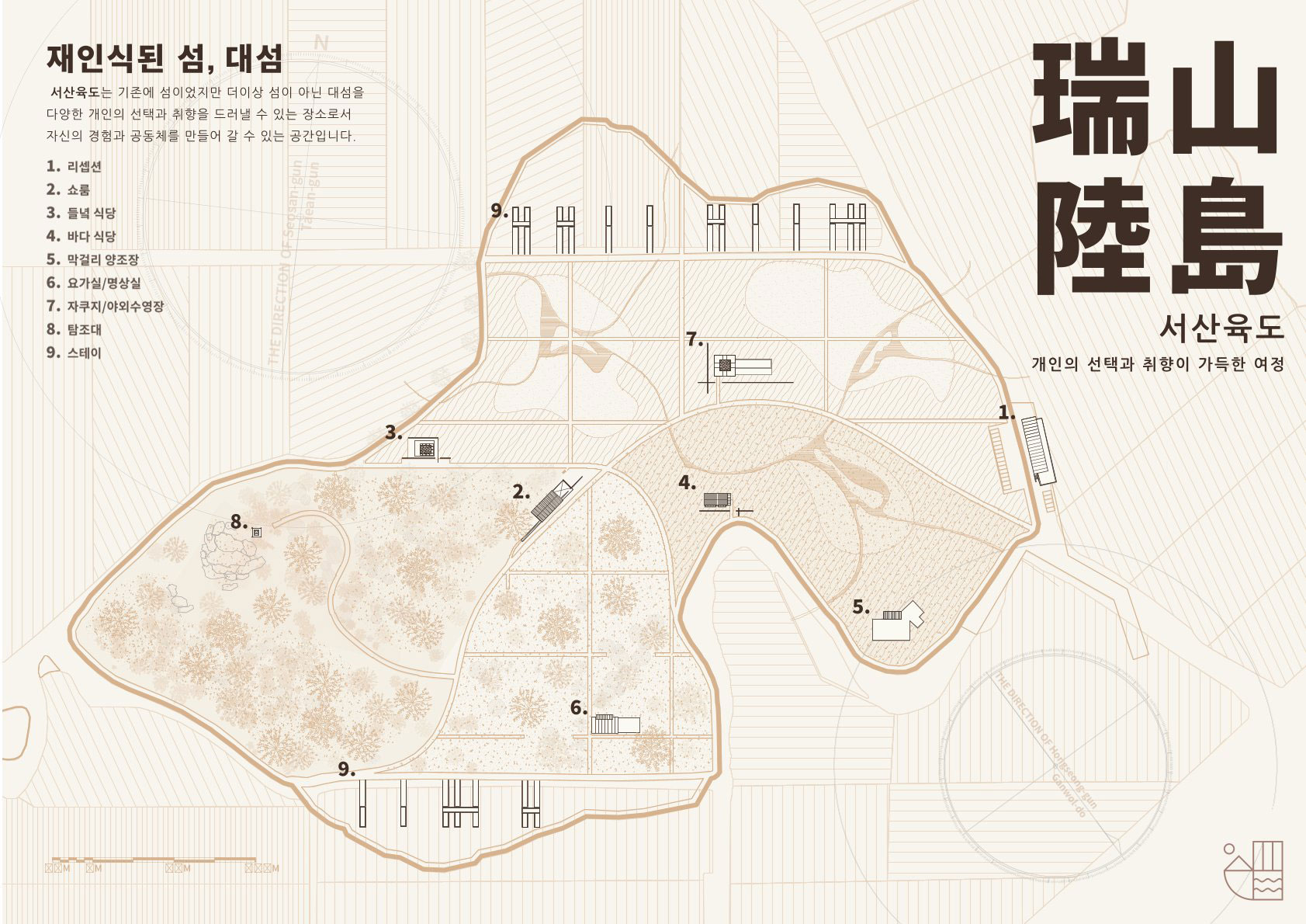 서산 땅 위의 섬이라는 뜻의 서산육도는 사회와 개인의 정체성을 투영하여 이해할 수 있다. 바다로 둘러싸였던 대섬 주변은 간척되어, 갯벌과 바다가 논으로 바뀌었다. 그럼에도 우리는 이곳을 여전히 본래의 정체성이 담긴 이름 ‘대섬’으로 부른다. 따라서 대섬(서산육도)의 원시성을 복원하고 바다와 논의 어휘로 공간을 규준하고 땅의 시간의 층위를 드러내었다.