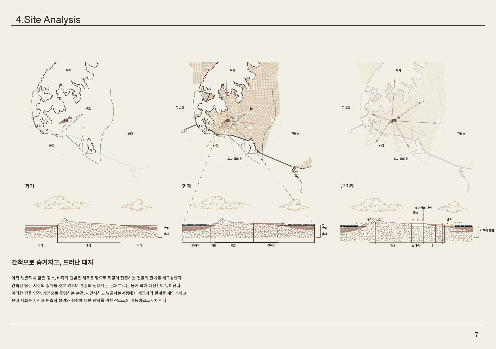 아직 발굴되지 않은 장소, 바다와 갯벌은 새로운 땅으로 뒤덮어 잔존하는 것들의 관계를 재구성한다. 간척된 땅은 시간의 층위를 갖고 있으며 갯골의 생태계는 논과 흐르는 물에 의해 대전환이 일어난다. 이러한 땅을 인간, 개인으로 투영하는 순간, 재인식하고 발굴하는 과정에서 개인과의 관계를 재인식하고 현대 사회속 자신과 원초적 행위와 취향에 대한 탐색을 위한 장소로의 가능성으로 이어진다.