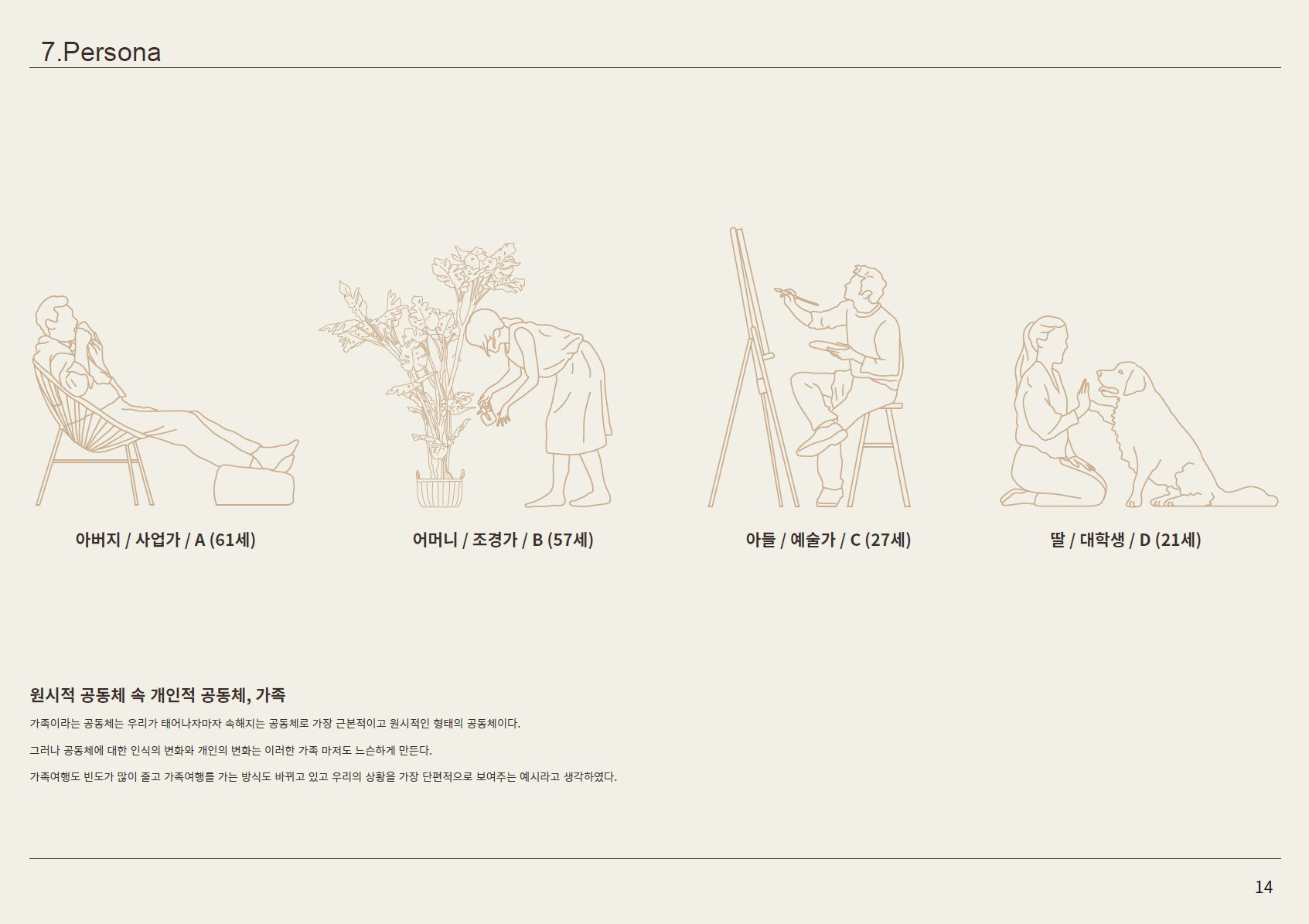 가족이라는 공동체는 우리가 태어나자마자 속해지는 공동체로 가장 근본적이고 원시적인 형태의 공동체이다. 그러나 공동체에 대한 인식의 변화와 개인의 변화는 이러한 가족 마저도 느슨하게 만든다. 가족여행도 빈도가 많이 줄고 가족여행를 가는 방식도 바뀌고 있어 우리의 상황을 가장 단편적으로 보여주는 예시라고 생각하였다.