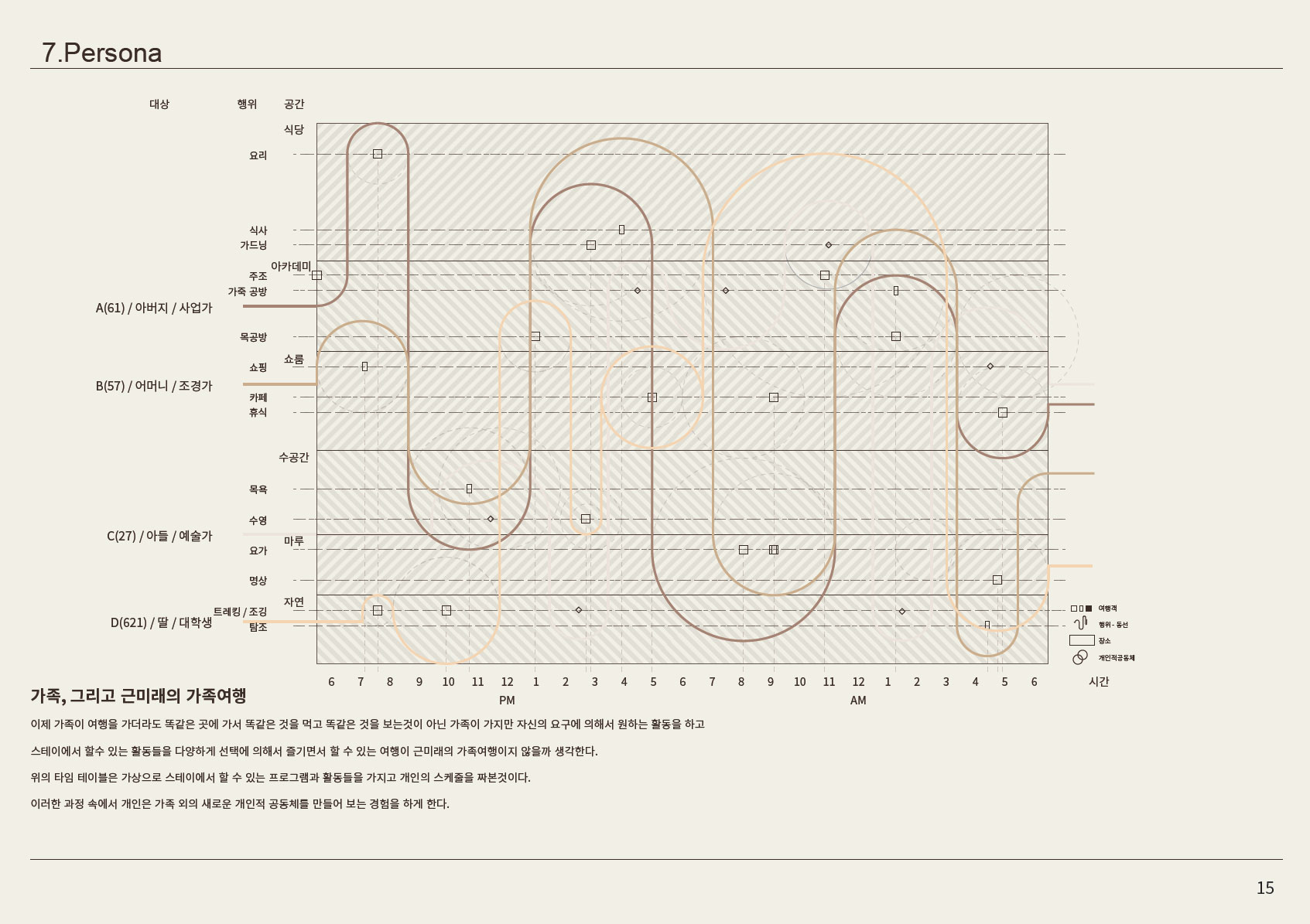 이제 가족이 여행을 가더라도 똑같은 곳에 가서 똑같은 것을 먹고 똑같은 것을 보는 것이 아닌, 함께 가더라도 각자의 요구에 의해서 원하는 활동을 하고 스테이에서 할수 있는 활동들을 다양하게 선택하고 즐길 수 있는 여행이 근미래의 가족여행이지 않을까 생각한다. 타임 테이블은 가상으로 스테이에서 할 수 있는 프로그램과 활동들을 가지고 개인의 스케줄을 짜본 것이다. 이러한 과정 속에서 개인은 가족 외의 새로운 개인적 공동체를 만들어 보는 경험을 하게 한다.