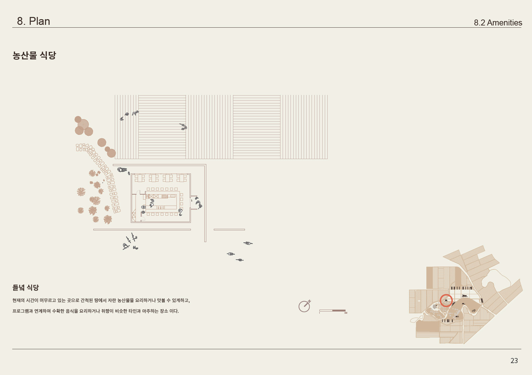 • 식당: 하루의 여정을 마치고 돌아와 지인들 또는 여행지에서 만난 사람들에게 각자의 취향을 담은 경험을 공유하는 장이 된다. 운영시간 이외에는 자유롭게 이용하며 내가 아닌 타인을 위한 요리를 하거나 주문된 도시락을 가지고 개인 공간에서 즐길 수 있다.