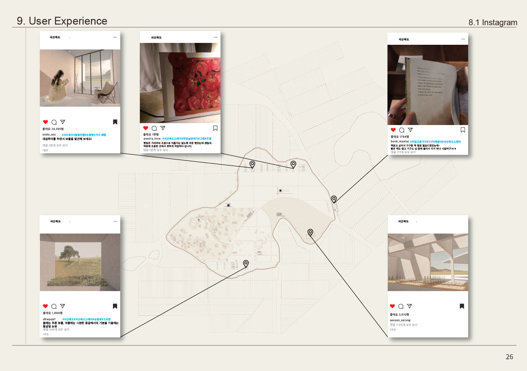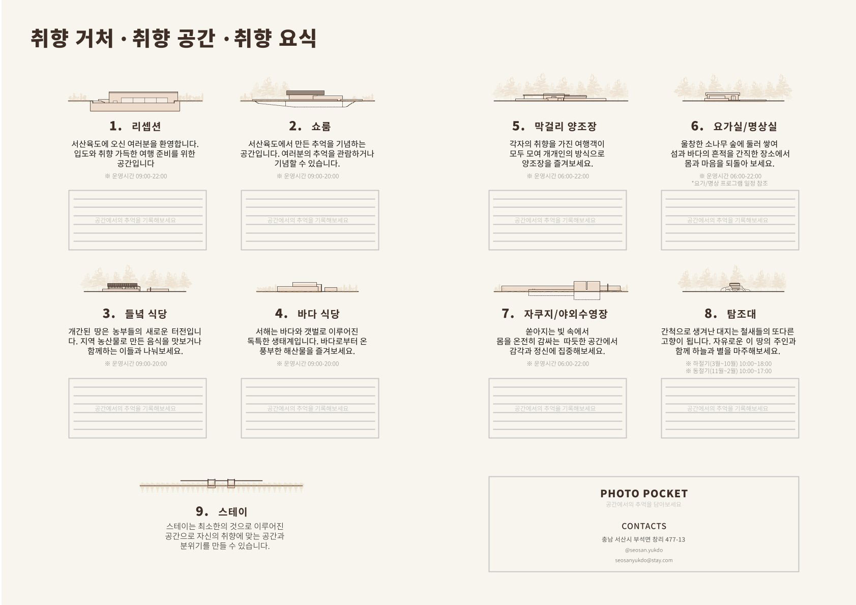 노경록 일반적으로 여행이라고 하면 평소에 하지 못하던 것을 하기 위해 가는 경우가 많다. 그런데 이 팀은 아예 새로운 여행법을 제시했다고 볼 수 있을 것 같다. 현재의 스테이는 감각 있는 호스트가 제안한 공간을 즐기기 위해 찾아가는 곳이라면, 서산육도는 내가 선택한 요소들로 구성된 여행과 공간을 제안한다. 이러한 방식을 생각한 이유가 있나?