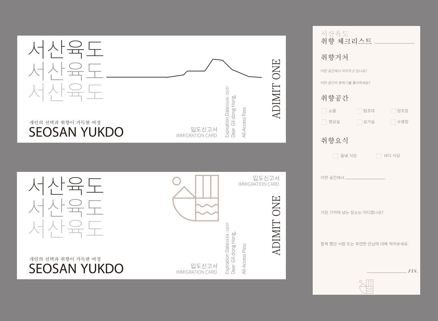 서산육도 이제는 흙을 덮어 육지가 되었지만 여전히 섬이라는 정체성을 잃지 않고 ‘대섬’이라 불리는 이 땅의 특수성을 여행객들도 인지해주었으면 하는 마음에 ‘입도 신고서’라는 표현을 선택했다.