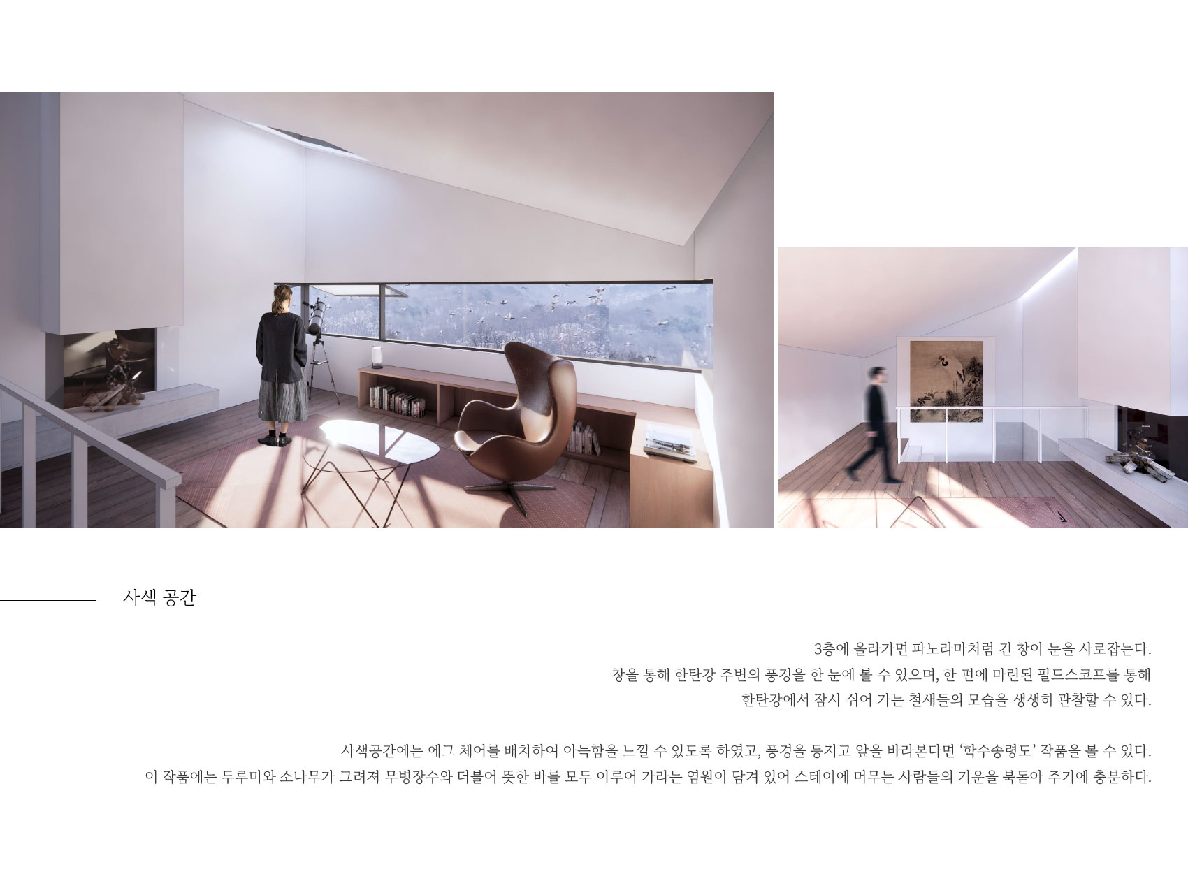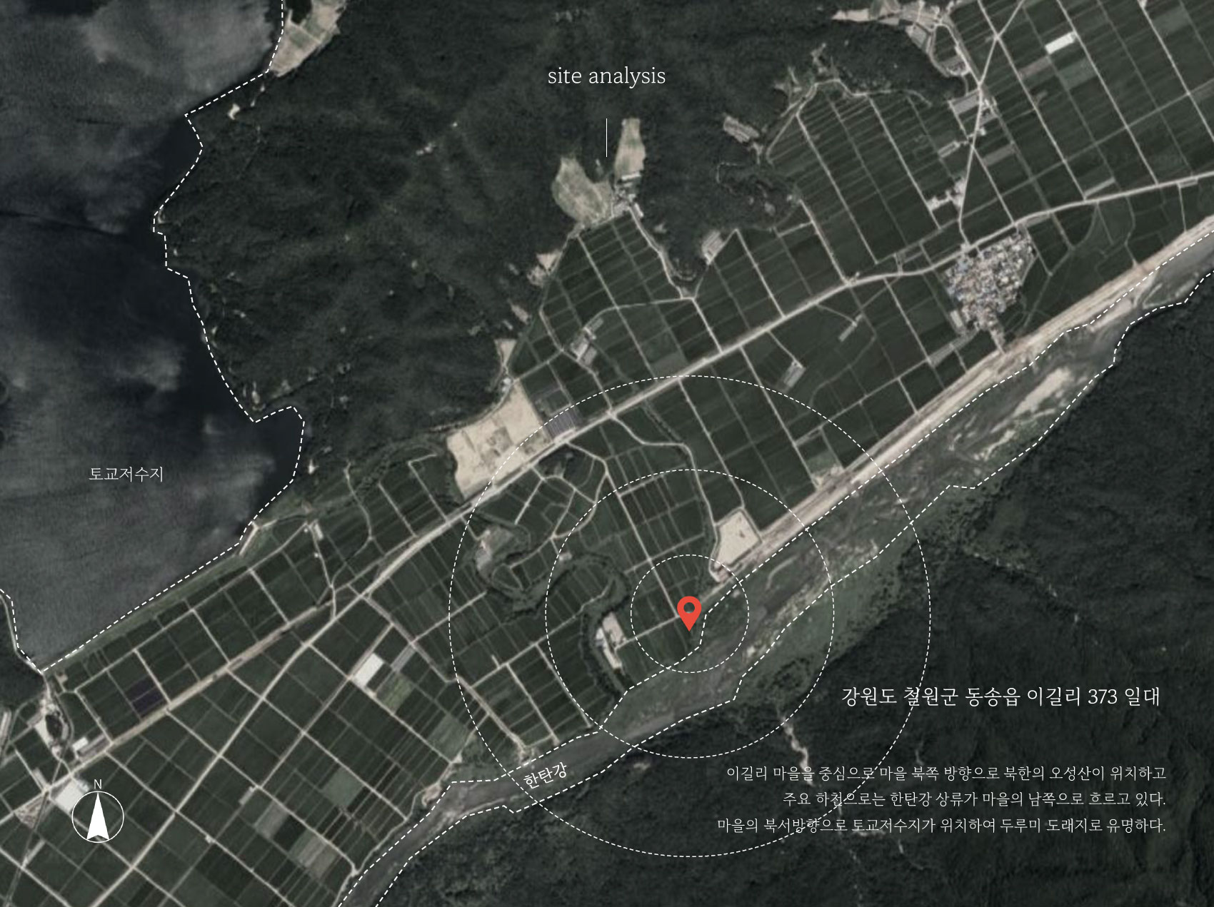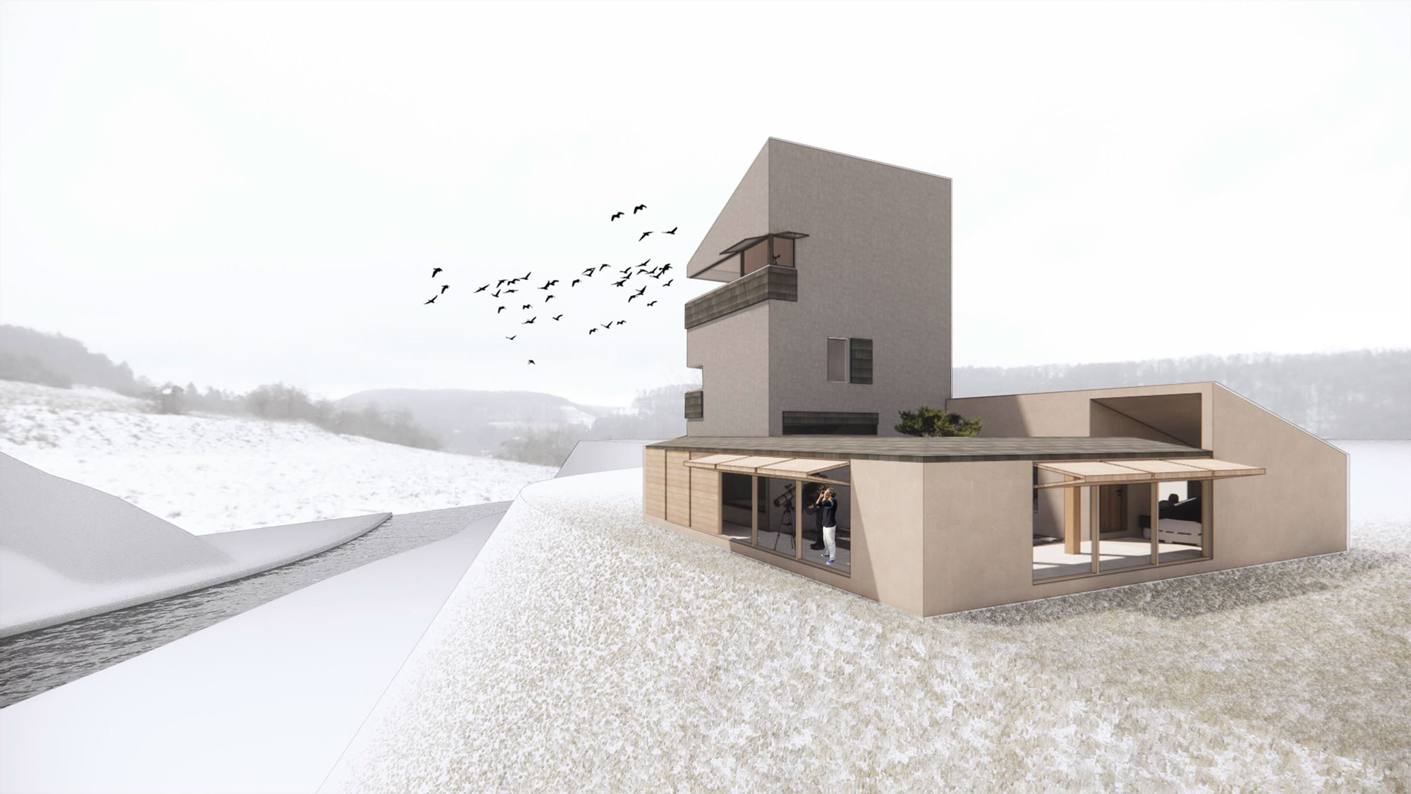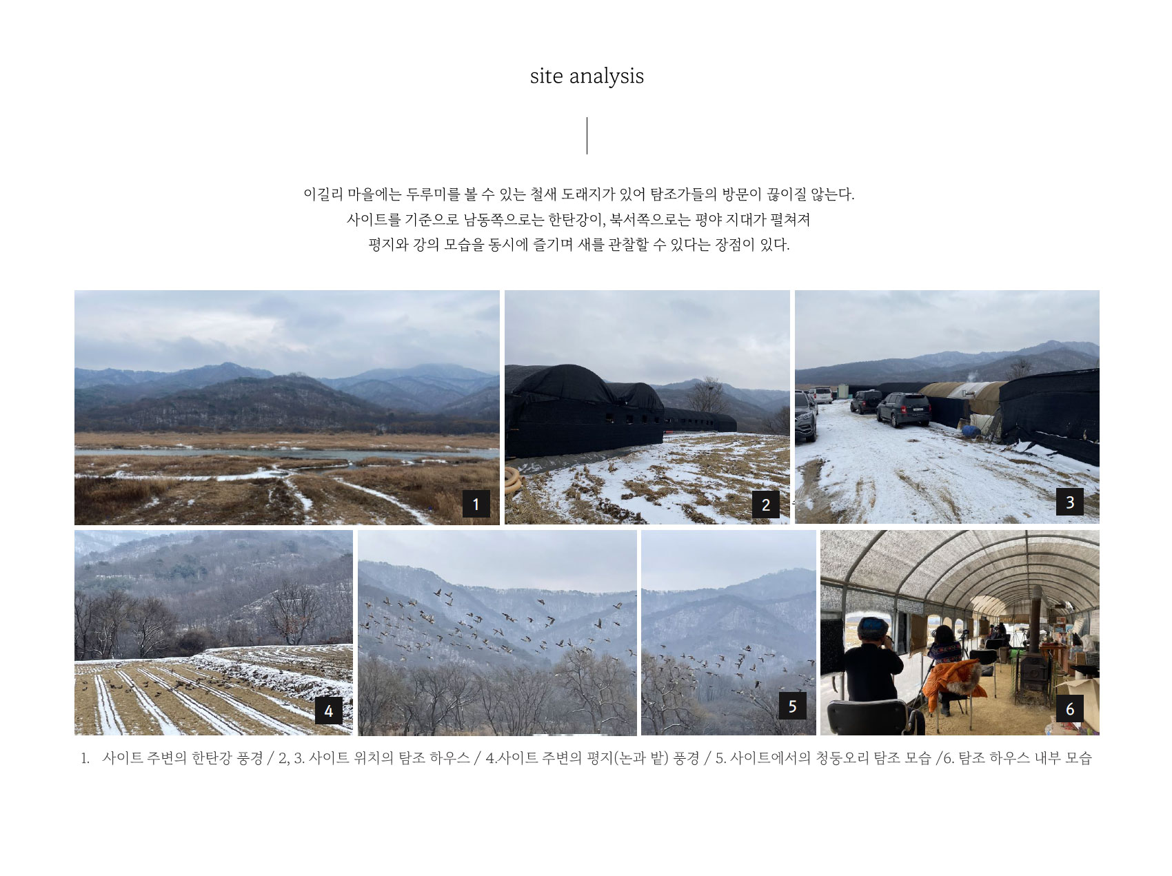 자신을 비추는 집, 탐조가는 새들의 움직임을 보며 사색하는 아이디어에서 시작된 프로젝트입니다. 대규모의 철새 무리 군무는 사람들의 감탄과 부러움, 위안 등 다양한 감정을 느낄 수 있게 합니다. 사이트는 철원 철새 도래지로 매년 수많은 겨울철새들이 월동하는 휴식처입니다. 겨울에도 따듯한 물이 흘러 먹이를 구하기 쉽고, 러시아, 중국, 일본의 중간의 위치한 국제적인 철새도래지의 역할을 하고 있습니다. 또한 남동쪽으로는 한탄강이, 북서쪽으로는 평야 지대가 펼쳐져 있어 평지와 강의 모습을 동시에 즐기며 새를 관찰할 수 있습니다.