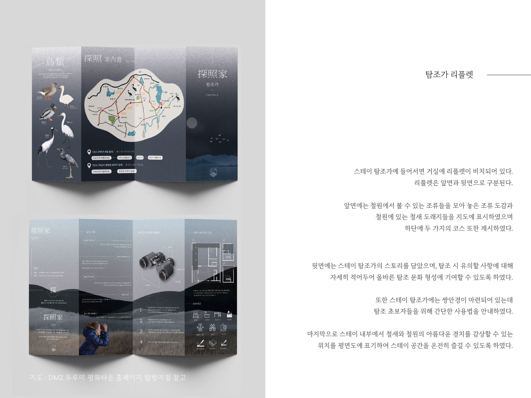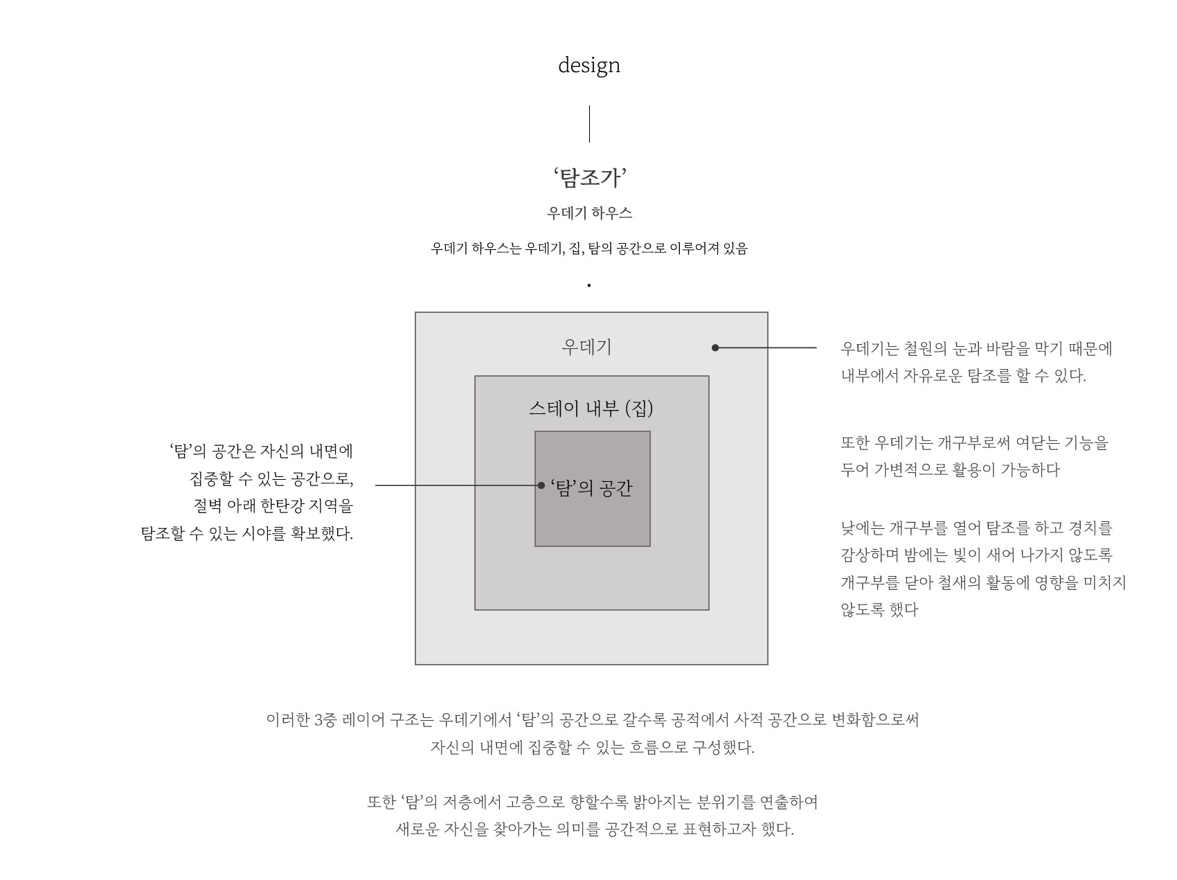 탐조가의 설계원칙은 철새들에게 영향을 미치지 않으며 탐조할 수 있는 공간을 만드는 것으로 우데기, 스테이 내부, 탐의 공간인 3중 레이어 구조로 이루어져 있습니다. 밤에는 빛이 새어나가지 않도록 우데기를 닫아 철새에게 최대한 영향을 미치지 않도록 했습니다. 또한 탐의 공간은 한탄강의 두루미를 탐조할 수 있는 시야를 확보했습니다.