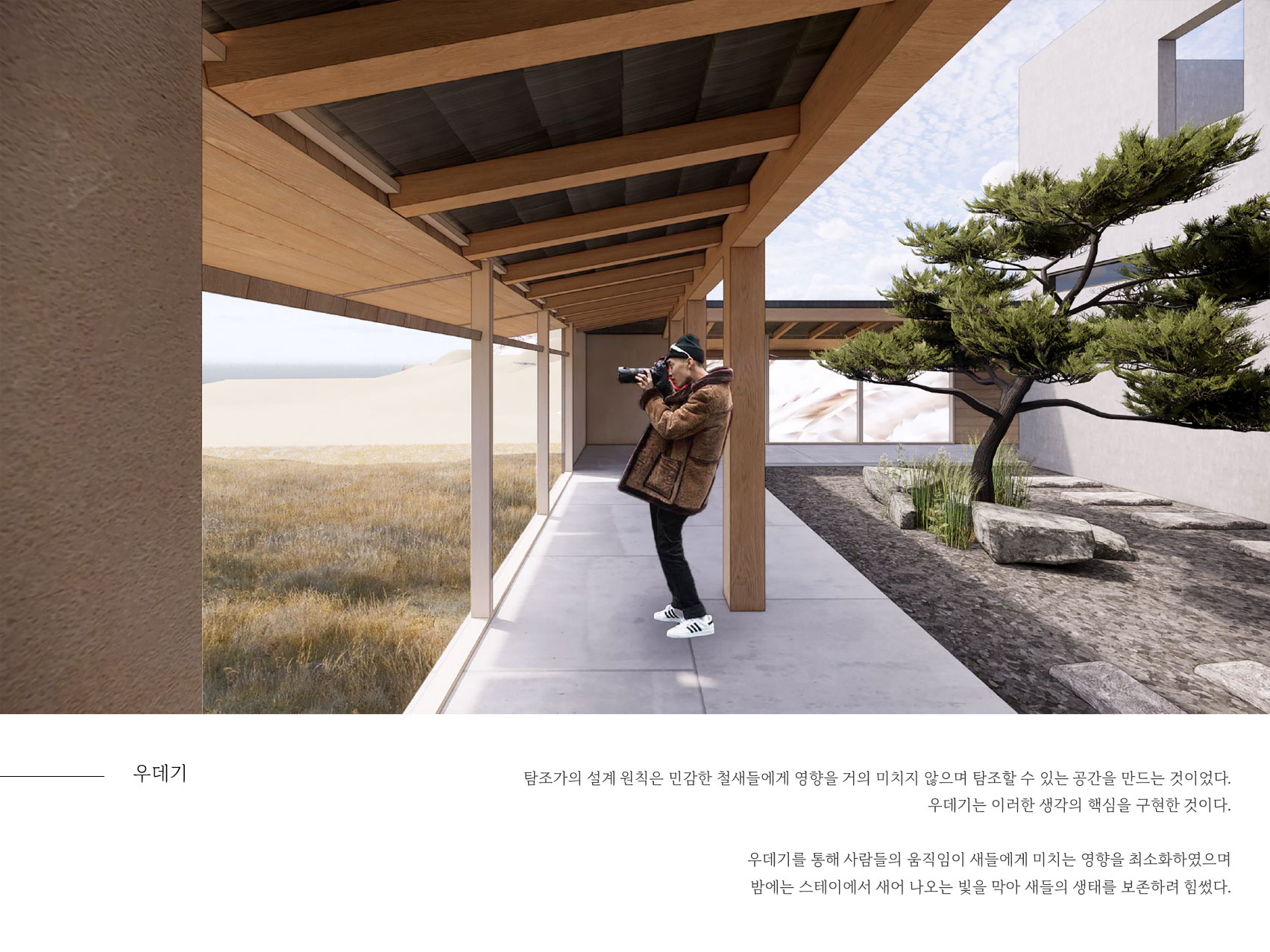 탐조가 사이트 답사를 갔을 때 비닐하우스 안에서 탐조를 하는 모습을 보았다. 평양 쪽과 한탄강 쪽을 다 볼 수 있는 구조였는데 높이가 낮다 보니 탐조를 하는 데 한계가 있었다. (그래서 높은 매스를 두었다.) 우데기는 접었다 펼 수 있는 가변적인 구조로 계획했다. 창문 수도 최대한 적게 만들어 새들이 창문에 부딪혀서 죽는 버드 스트라이크를 방지하고, 밤에는 빛이 새어나가지 않도록 완전히 닫을 수 있게 했다. 지금의 매스는 최대한 새들에게 영향을 적게 미치면서 탐조를 더 편하게 할 수 있는 방향을 고민하며 디자인한 결과이다.