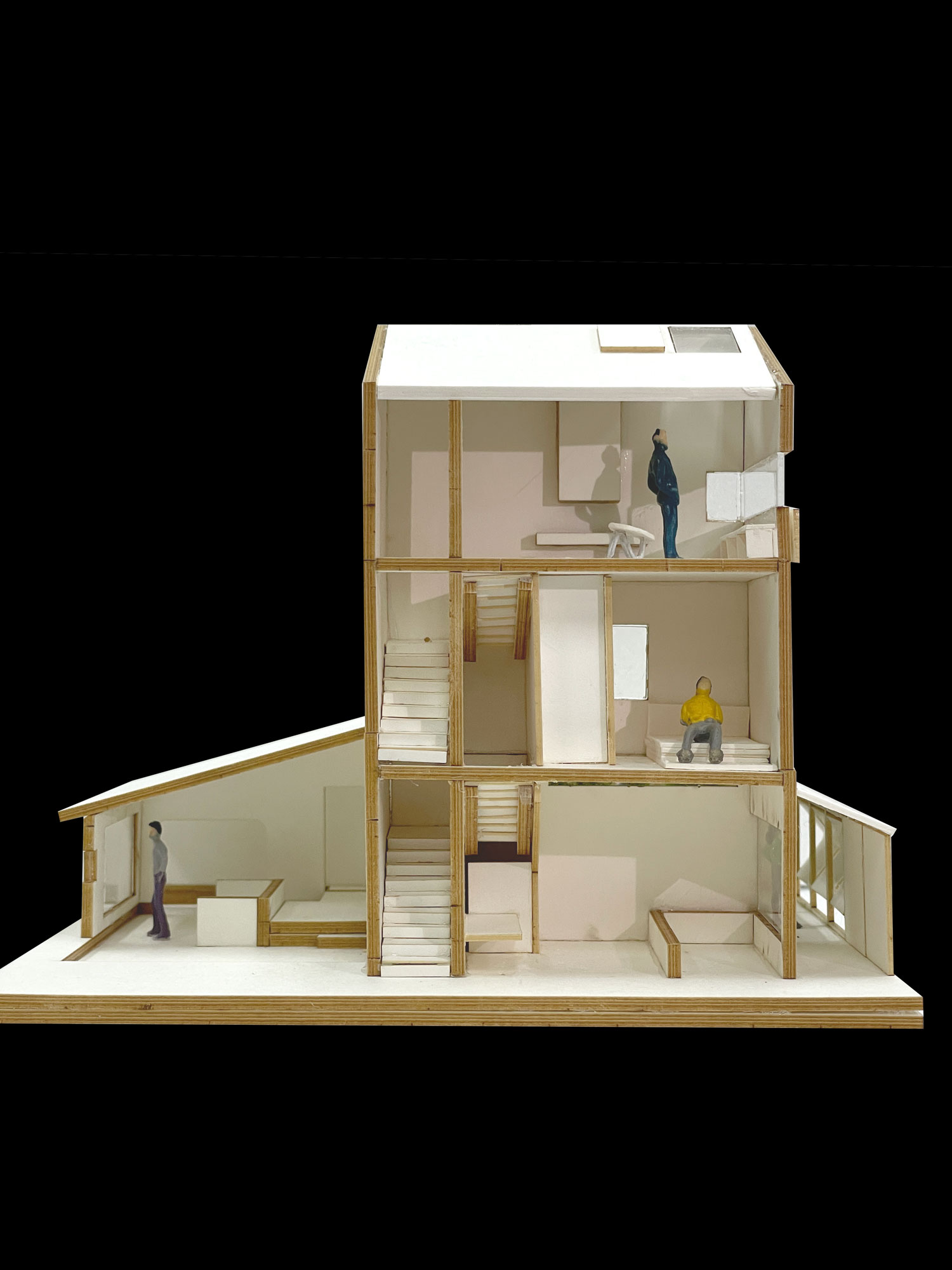 탐조가 이 사이트는 민간인 출입통제구역 안에 있는, 개발이 금지된 구역이다. 만약에 개발 제한이 풀린다면 개발을 하더라도 조심스럽게 다가가야 한다고 생각했다. 철새의 생태에 미치는 영향과 환경 파괴를 최소화하며 건물을 짓는 방법에 대해 고민했고, 우데기가 있으면 사람들이 움직이는 모습이 잘 보이지 않을 테니 새들이 받는 스트레스를 줄일 수 있을 것이라 보았다. 그리고 강원도 전통 가옥의 특징도 사용했다. 모형을 보면 기와처럼 보이는 부분이 나무 판자를 얹어서 만든 ‘너와’이다. 강원도 지역에서는 이를 지붕으로 활용했다고 한다. 사이트 답사를 갔을 때 직접 촬영해 와서 건물에 적용해보았다.