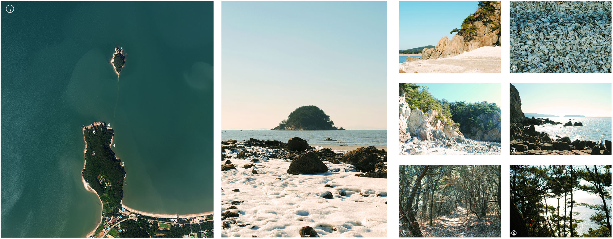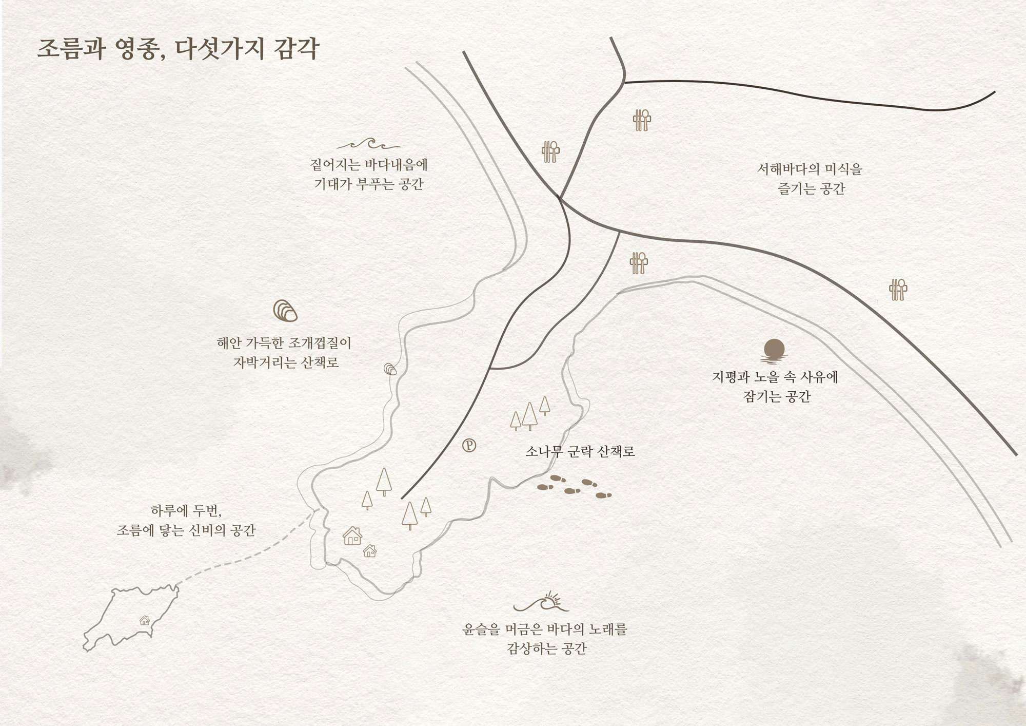 도시의 삭막함에서 시골의 느슨함으로 바뀌어가는 풍경과 연안에 가득한 굴과 조개 껍데기의 기분 좋은 잘박거림을 넘어 용유도 더 깊은 곳으로 접어들며 가다보면 안락함이 느껴지는 소나무 군락 속에서 간조와 만조가 만들어내는 두 가지의 풍경이 몽환적인 조름섬을 바라보는, 바다 위에 잔잔히 놓여진 용유도 사이트에 도착하게 된다.