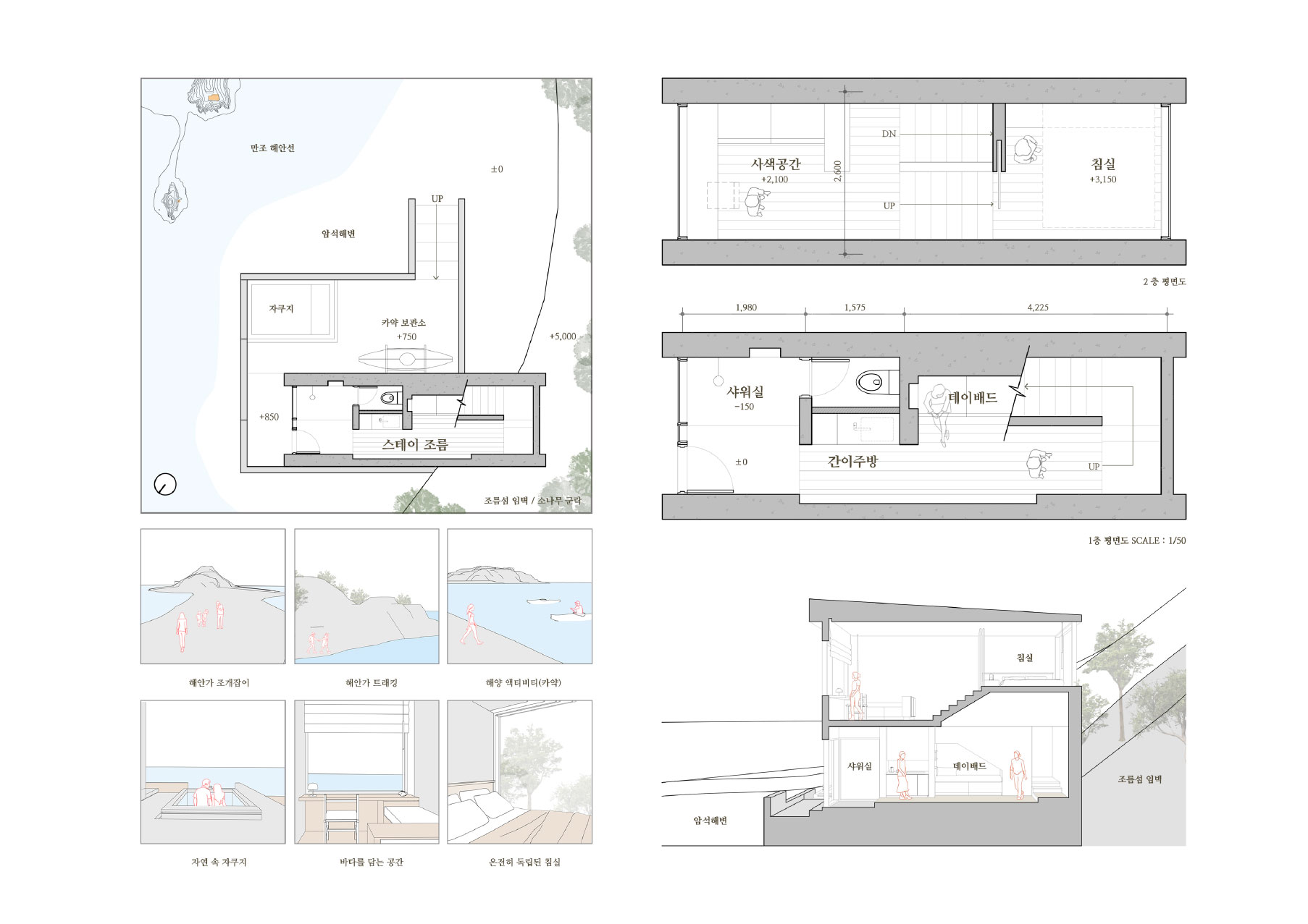 또한 이렇게 공간을 구획하면 기상 악화 등의 이유로 조름섬에 들어가지 못할 때에도 안전한 본채에 머무르면서 여전히 조름섬을 바라볼 수 있다. 용유도에 메인 스테이를 만들고 조름섬을 바라보며 기다리다, 물길이 열리면 직접 걸어가서 그 공간을 향유하고 돌아오는 것이 더 풍부한 경험이 될 것이라 생각했다.