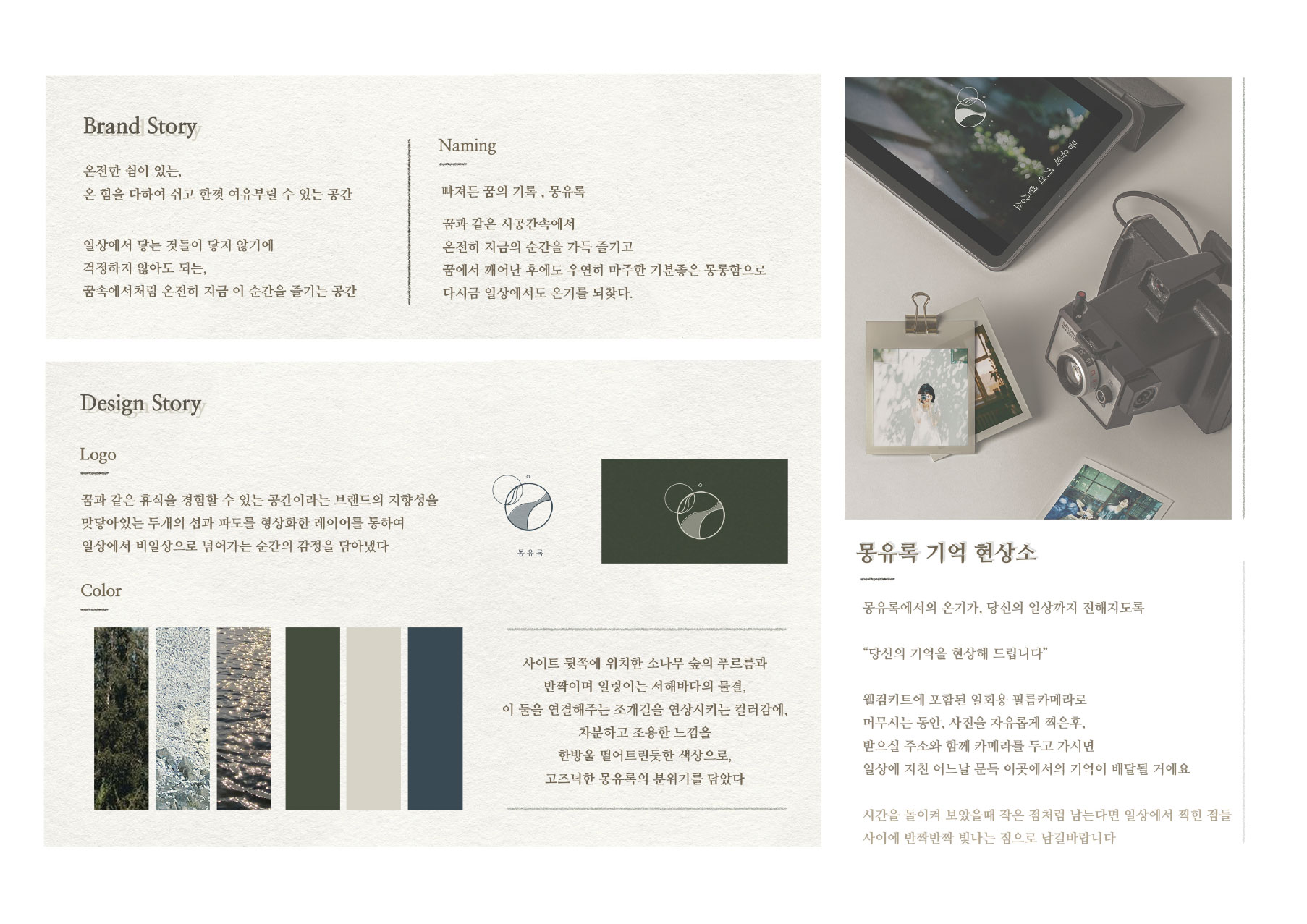 따라서 일상의 레이어에 한발 걸쳐 있지 않고 완벽히 꿈같은 비일상으로의 여행을 보낼 수 있는 온전한 쉼이 있는 공간, 온 힘을 다하여 쉬고 한껏 여유 부릴 수 있는 아늑한 공간, 일상에서 닿는 것들이 닿지 않기에 걱정하지 않아도 되는 꿈속에서처럼 온전히 지금을 즐기는 공간, 어쩌면 당신의 가장 솔직한 이야기가 쓰일 수 있는, 아늑하고 몽롱한 공간, 비일상의 다양한 가능성이 쓰여 나갈 수 있는 공간 ‘몽유록’을 제안한다.