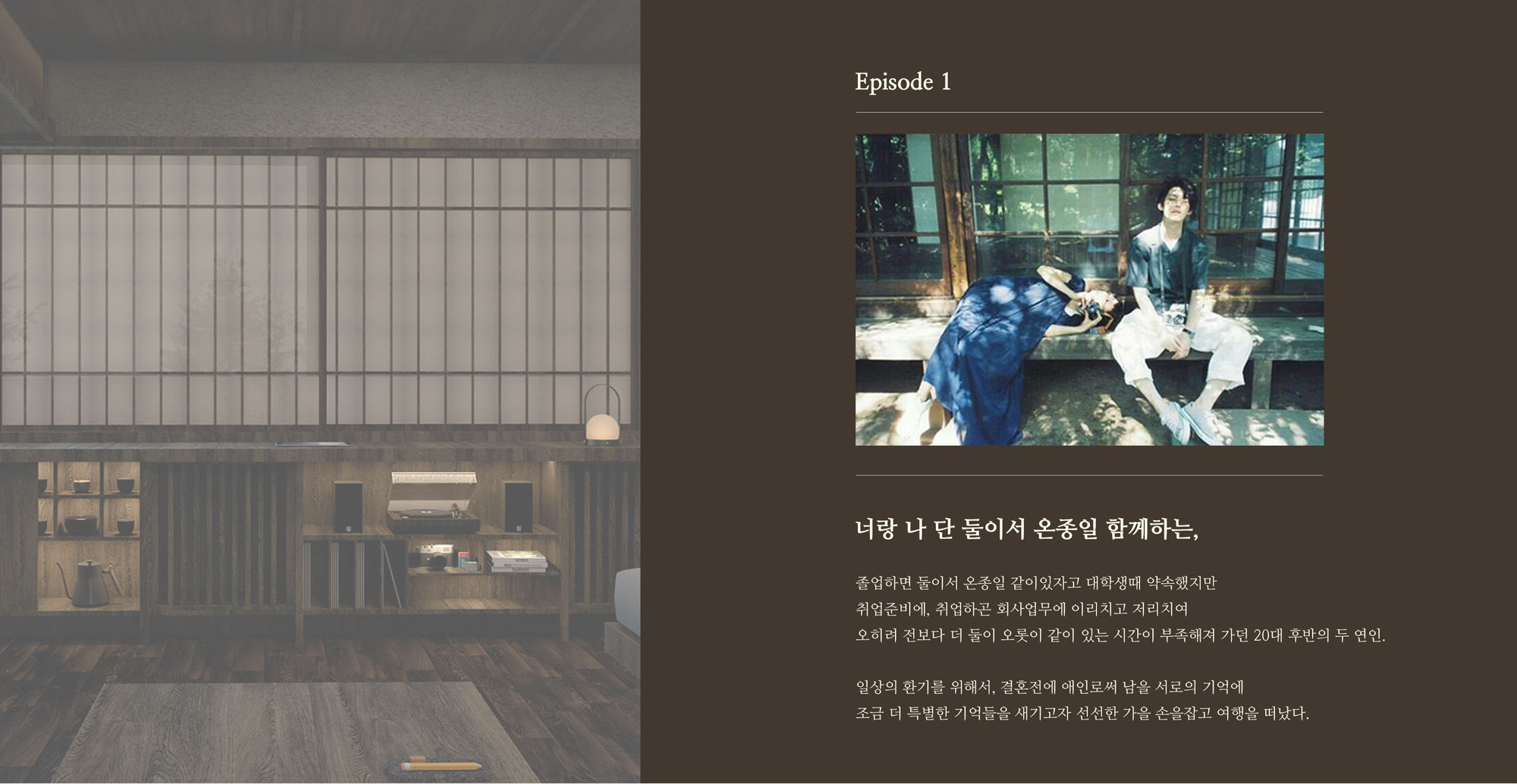 - 졸업하면 둘이서 온종일 같이 있자고 대학생 때 약속했지만 취업 준비에, 취업하곤 회사 업무에 이리 치이고 저리 치여 오히려 전보다 더 둘이 오롯이 같이 있는 시간이 부족해져 가던 20대 후반의 두 연인. 일상의 환기를 위해서, 결혼 전에 애인으로써 남을 서로의 기억에 조금 더 특별한 기억들을 새기고자 신선한 가을 손을 잡고 여행을 떠났다.