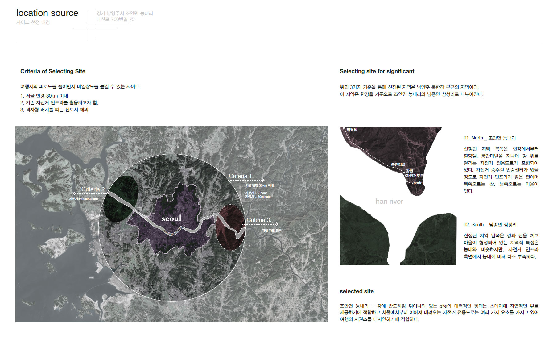 조안면 능내리. 강에 반도처럼 튀어나와 있는 site의 매력적인 형태는 스테이에 자연적인 뷰를 제공하기에 적합하고, 서울에서부터 이어져 내려오는 자전거 전용도로는 여러 가지 요소를 가지고 있어 여행의 시퀀스를 디자인하기에 적합하다.