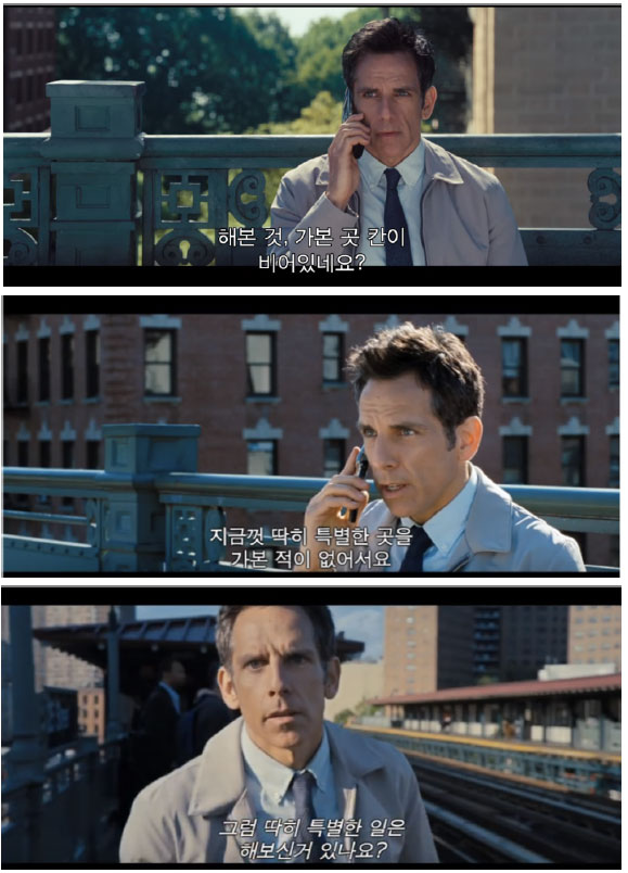 영화 ‘월터의 상상은 현실이 된다’에서 연애 매칭사이트 e-하모니의 담당자 토드와 월터의 대화. 그에게 매력을 느끼는 여자들에게 윙크를 받기 위해서는 해본 것, 가본 곳 칸을 건너뛰지 말라는 것이다. 또 마음에 드는 여성에게 윙크를 보내기 위해서도 마찬가지다. 즉 직업이나 학벌 같은 나타내기 쉽고 지루한 요소가 아니라, 내 삶과 자아정체성을 나타내는 해본 것, 가본 곳 칸을 우리는 건너뛰어서는 안 된다. 무엇이 중요한지 잊고 사는 것 같다.