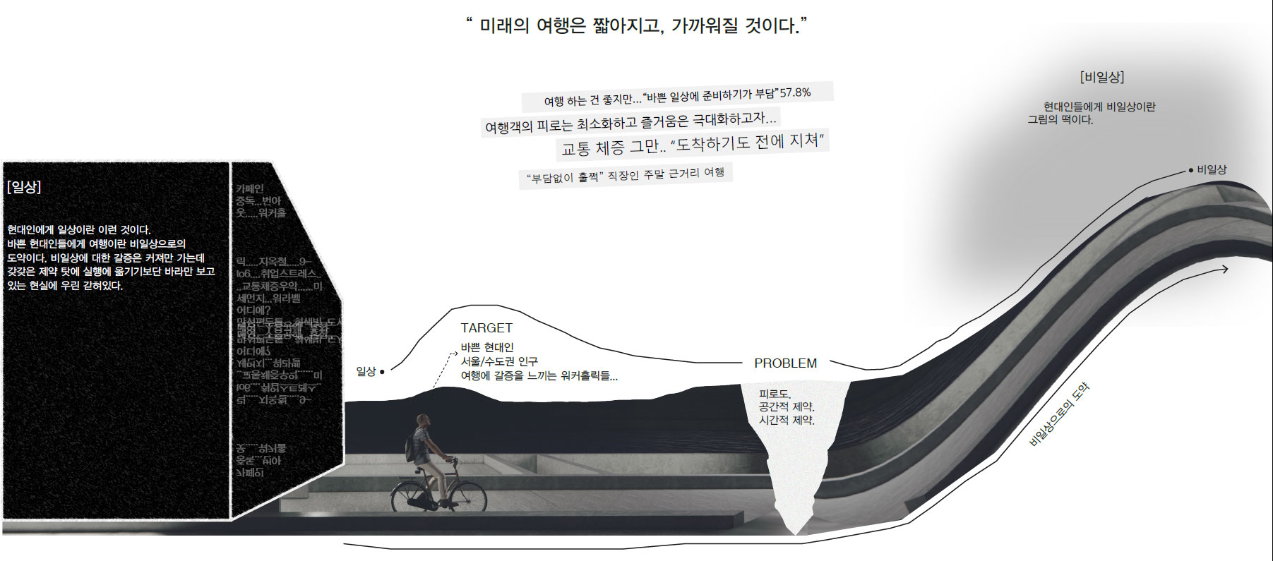 바쁜 현대인, 여행에 갈증을 느끼는 워커홀릭들에게 일상의 피로, 시공간적 제약은 여행을 그림의 떡으로 느끼게 합니다. 따라서 저희 팀은 앞으로의 여행이 더 짧아지고 가까워져야하지 않을까 생각했습니다.