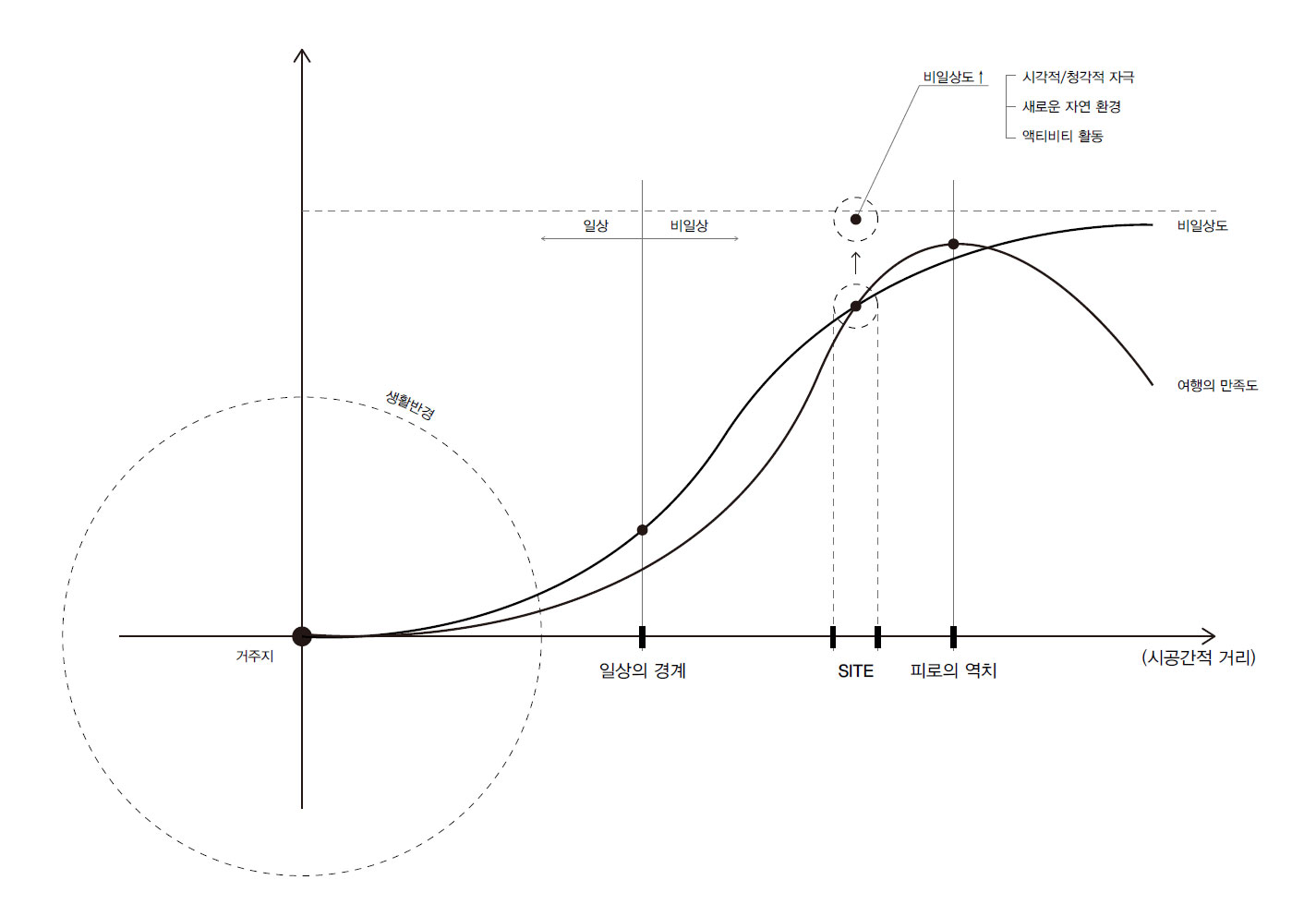 노경록 발표 중에 ‘피로의 역치’가 나와 있는 다이어그램, 여행지까지의 거리와 일상의 경계를 나타낸 그래프가 인상적이었다. 여행지까지의 거리가 너무 멀고 피로도가 높아지면 여행의 즐거움에도 영향을 미친다는 설명은 좋고 어느 정도는 사실이다. 설득력이 있다고 느껴지는 동시에 억지스럽지 않나 하는 생각도 들었다. 누군가에게는 저 교차점이 제주도일 수도 있고, 누군가에게는 유럽일 수도, 심지어 누군가에게는 달나라일 수도 있다. 이러한 전제가 현재의 사이트를 선정하는 과정에서 어떤 영향을 미쳤는지 궁금하다.