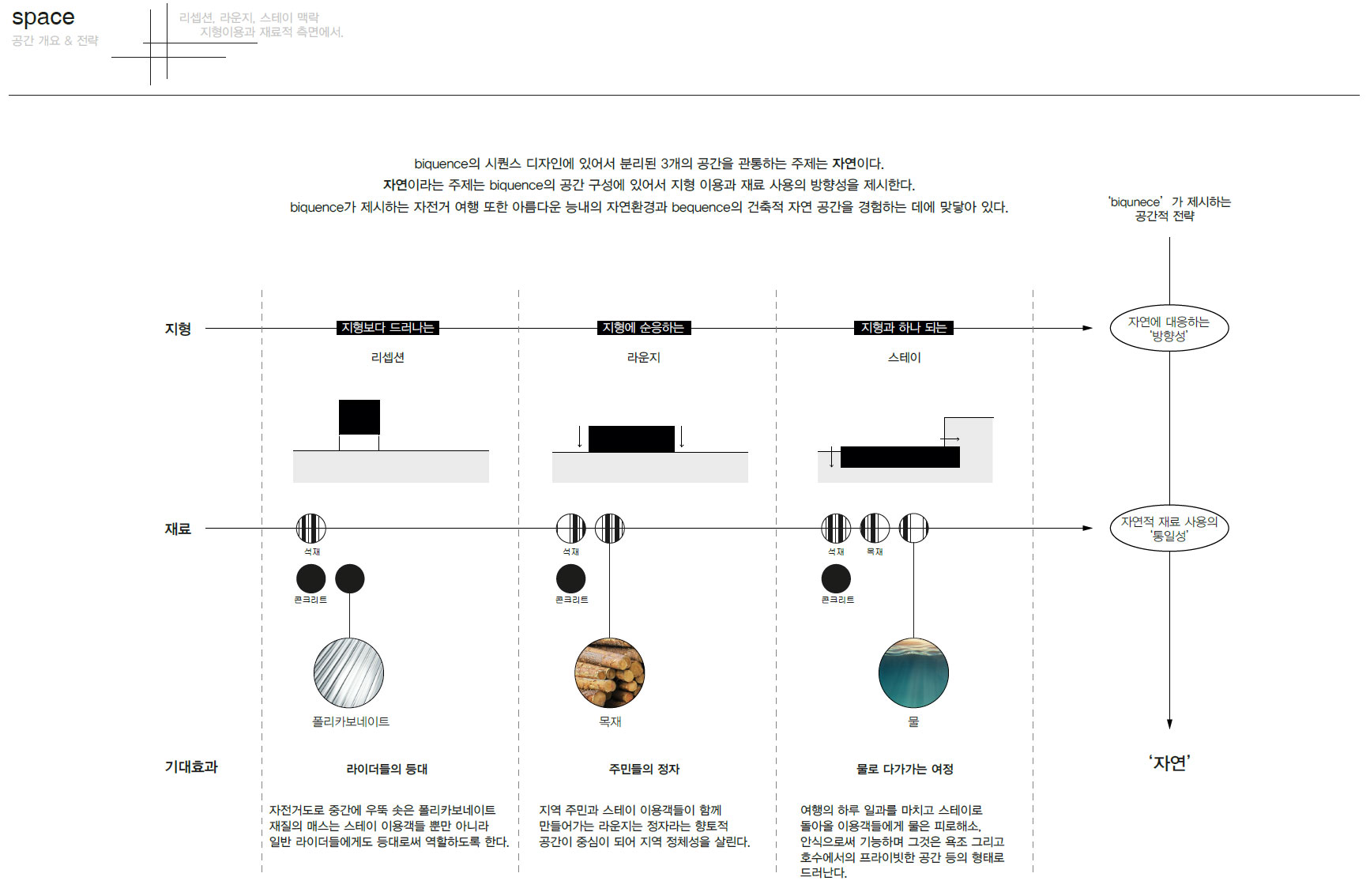 시퀀스 디자인은 능내 기존의 자전거 인프라를 활용하고 연장하는 방향으로 진행되었습니다. 터널을 통과해 강 위를 달리고 숲속을 지나는 자전거 전용도로 곳곳에 프로그램을 배치 함으로써 biquence만의 시퀀스를 완성하였습니다. 보통은 숙소 내에서 해결되는 리셉션과 라운지와 같은 프로그램을 외부로 분리하여 다채로운 시퀀스를 구성하고 분리한 외부공간들을 오가는 수단을 자전거, 도보 등으로 다양하게 설정함으로써 변화하는 시퀀스의 속에서 색다른 경험을 하도록 유도하였습니다.