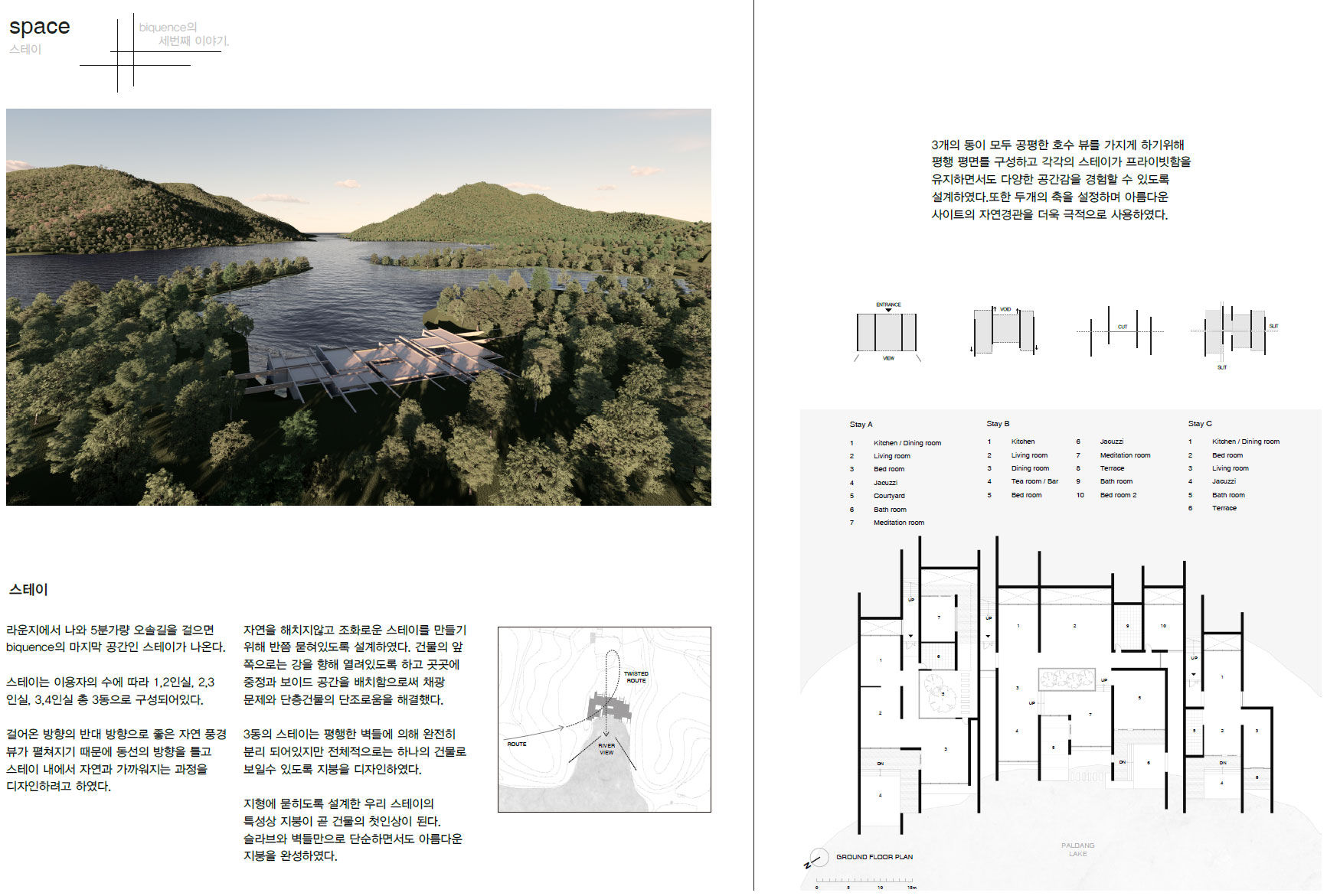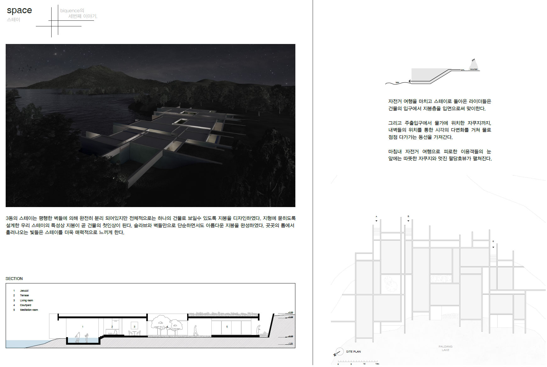 이상묵 리니어한 계획을 가지고 여러 기능을 분산해서 제안한 팀들이 몇몇 있었다. 이 팀도 리셉션, 라운지, 스테이가 일방향적으로 리니어하게 구성되어 있다. 투숙객이 자유롭게 동선을 선택하는 것이 아니라 시작점과 끝점으로 나아가는 방향성을 제한한 이유가 있는지? 이 스테이를 예약하면 무조건 이 순서대로 경험해야 하는건지 궁금하다.
