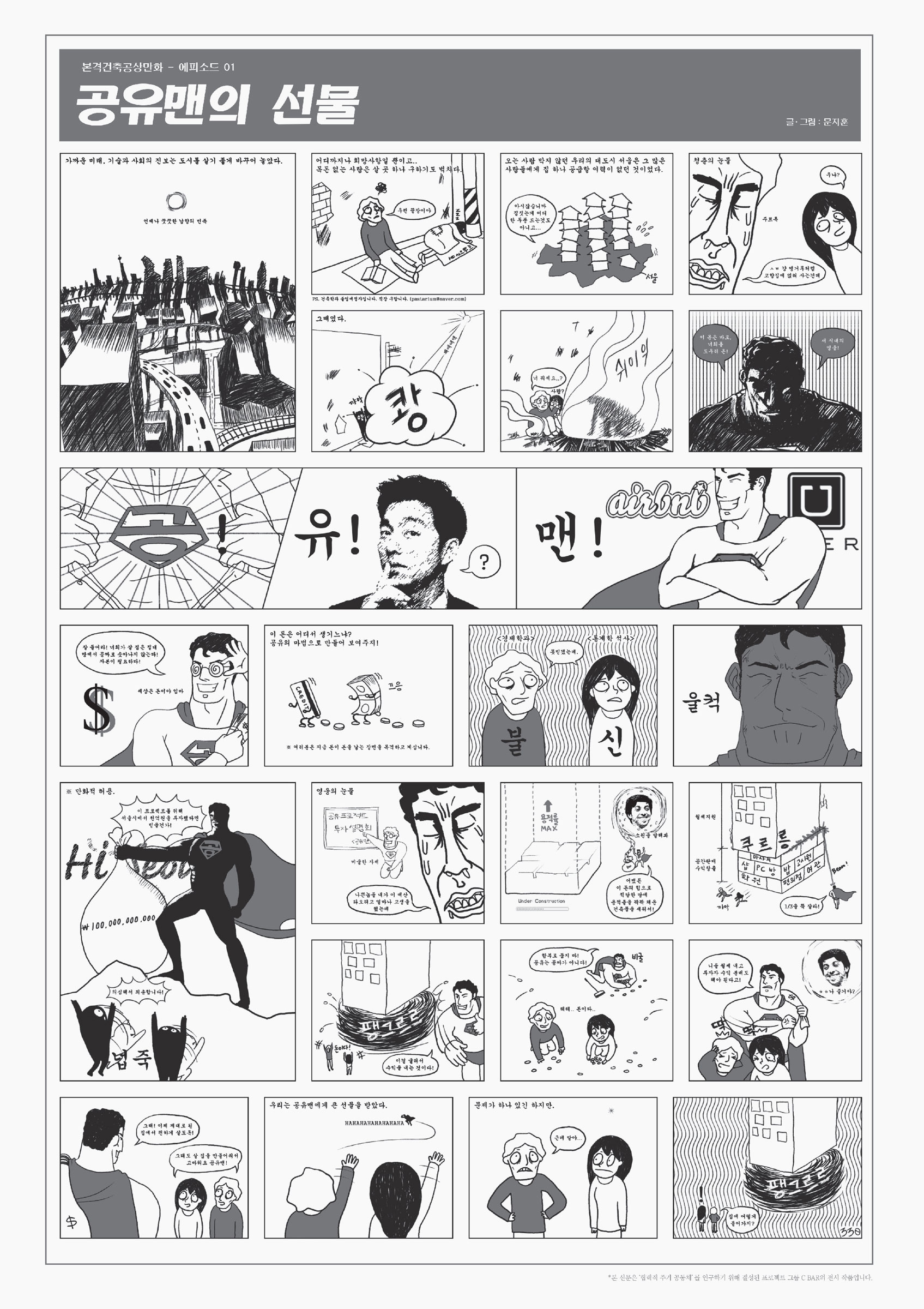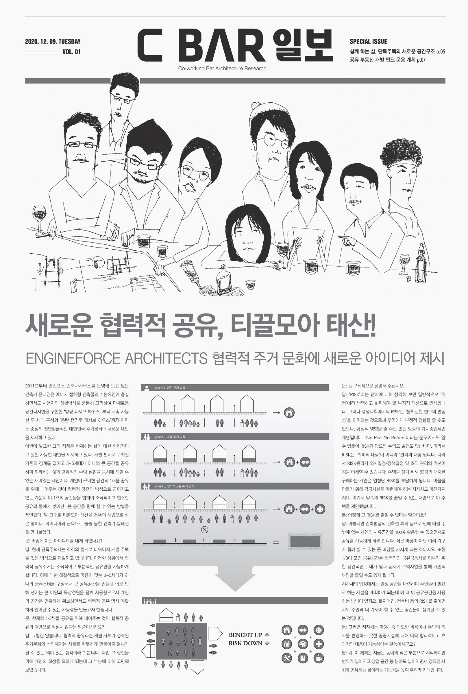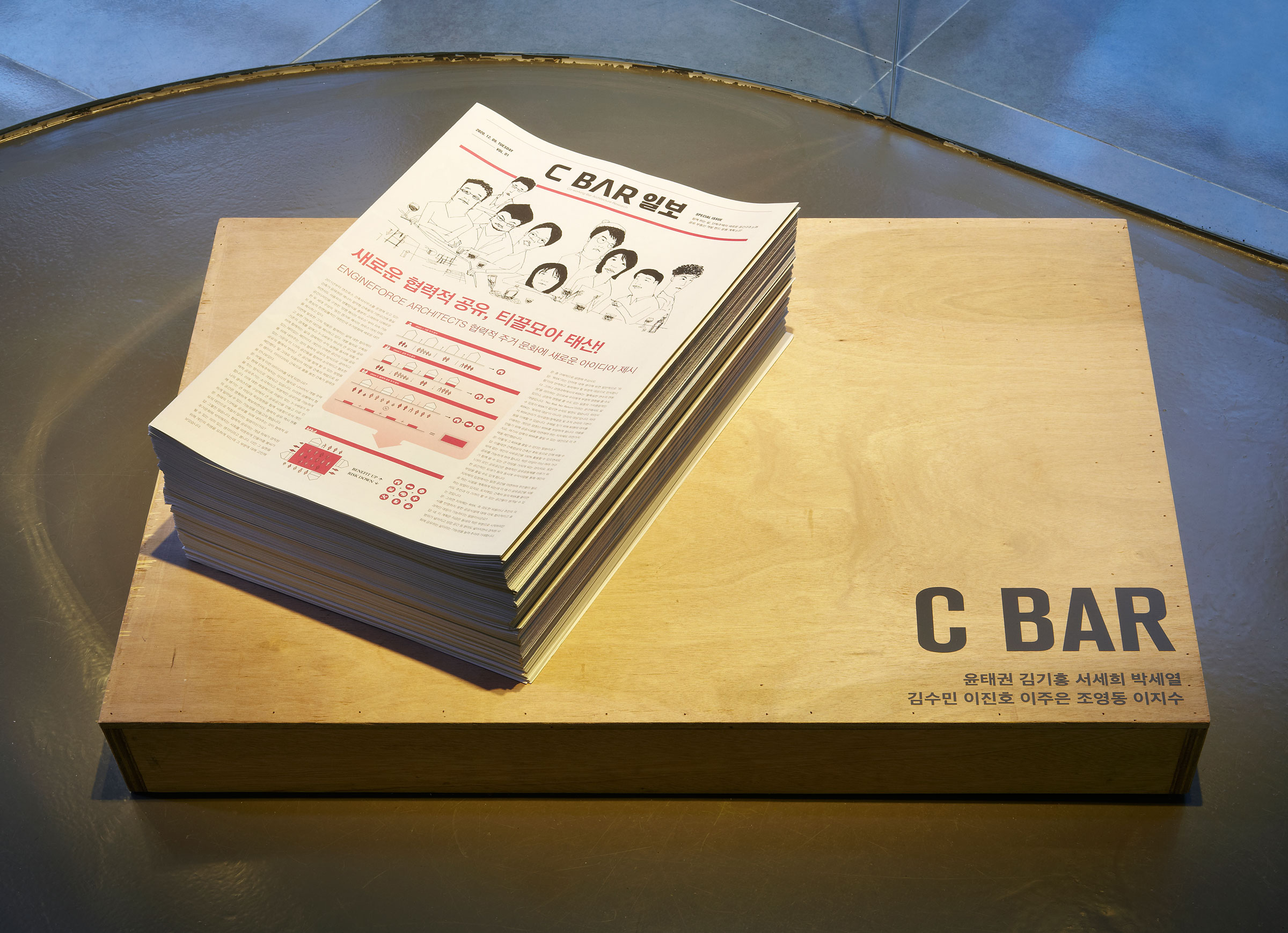 C BAR 김기홍: ‘협력적 공유’라는 키워드를 바라보는 동시대의 여러 관점에 대해 살피고 이 요소들이 합쳐지면서 만들 수 있는 새로운 가치에 대해 고민했습니다. 단순히 공간의 문제를 넘어서 말이죠. 중요하게 다룬 부분이 실제의 지구단위계획지 안에서 그 가능성을 가늠해 보는 것이었습니다. 그 고민에 대한 답이 이번 전시에서 제시한 1/3의 공유에 대해 내가 가진 것을 일부 내어주는 방법론이 되지는 않도록 하고 싶었습니다. 한국에서 집은 재산 가치로서 의미가 크기 때문에 공유를 위해 내 것을 일정 부분 포기하는 방법으로는 공감을 끌어내기 힘들다고 판단했거든요. 이를테면 피자 한 판을 어떻게 자를까가 아니라 그 재료들로 더 맛있는 무엇인가를 만들 수 있지 않을까에 대한 고민이었다고 봅니다. 또 그 과정에서 우리가 생각한 것들을 좀 더 자세하게 대중과 공유하고자 신문의 형식을 빌렸습니다.