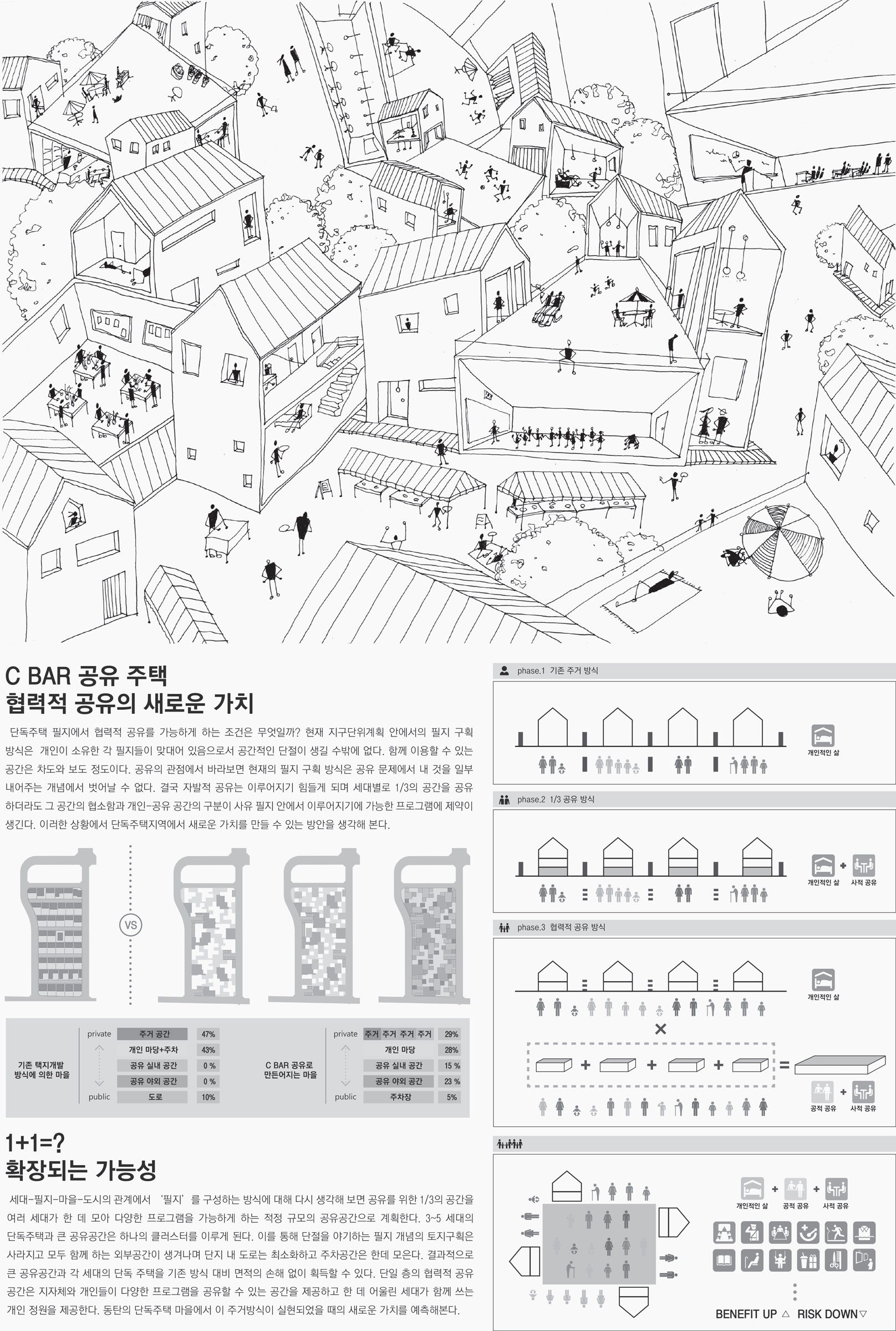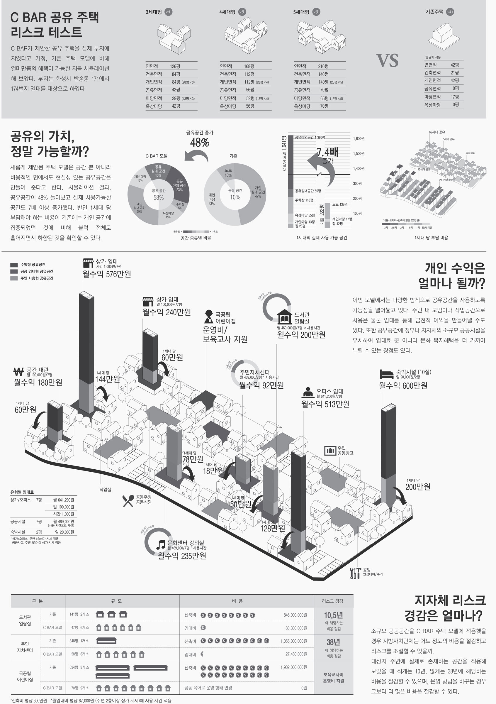 C BAR 서세희: 저희는 건축 바깥에 있는 것에 관심을 가지자는 것에서 시작했습니다. 예를 들어, 자본이나 비용이나 법적인 것들이나 사회적인 관계망 같은 것들을 가지고 공유 주거를 이야기해보자는 것이었죠. 이들이 건축 외적인 것이기는 하지만 실제로는 건축을 구성하는 데 굉장히 중요한 요소라고 생각했습니다. 크게 두 가지를 제안했는데, 첫 번째는 서울시에서 예산 1,000억을 들여 만드는 비즈니스 모델입니다. 여기에서는 공유 주거도 수익성을 낼 수 있다는 것을 전제로 했습니다. 그리고 두 번째는 택지를 개발하는 단계에서부터 택지를 구성하는 방법이나 유닛들이 조합되는 방식을 제안했습니다. 그래서 사람들 사이에 사용할 공유 공간을 주기도 하지만 그게 좀 더 확대되어 지자체나 개인이 부담해야 하는 비용까지 낮출 것이라는 가능성을 보여준 것이죠.