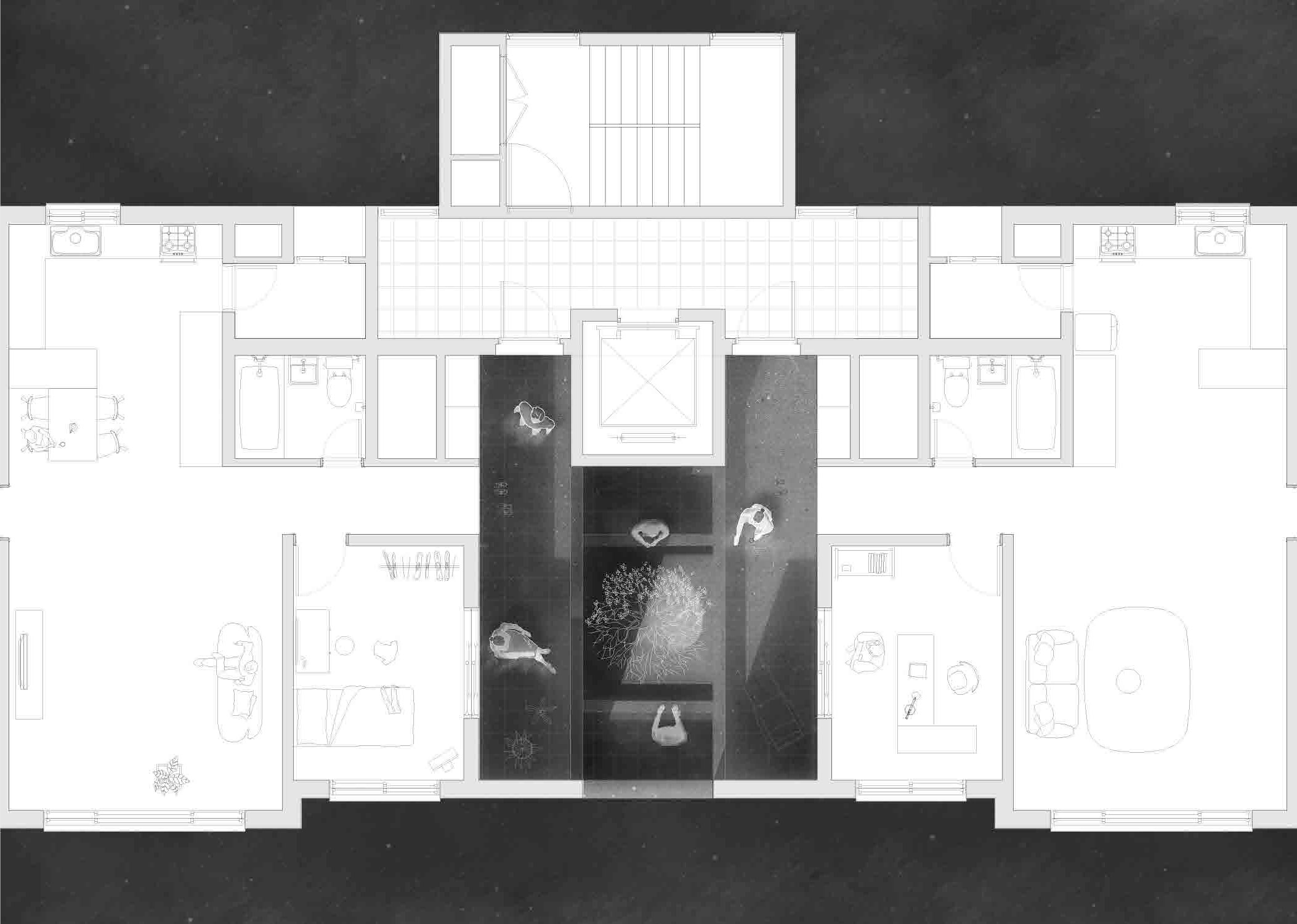 김수영: 저희는 아파트를 기본으로 하고 출발했어요. 그래서 공유 방식이라기 보다는 공유가 가져올 수 있는 효과 혹은 관계의 방향 설정이 조금씩 다른 것 같습니다. 아파트는 여러 층이 겹쳐 있고 여러 세대가 살기 때문에 저는 공유를 위한 어떤 프로그램을 넣기보다, 이미 있는 것의 부분들을 비워내어 ‘달빛을 공유’한다는 얘기로 주제를 잡고, 거기에 맞춰 건축적인 표현을 했습니다. 그래서 단면적으로 공간을 비워내고 그곳에 달빛이 공유됐을 때 이 집과 저 집 사이에 일어날 수 있는 상황이 조금씩 다를 거라는 가정하에서 작업했고요.