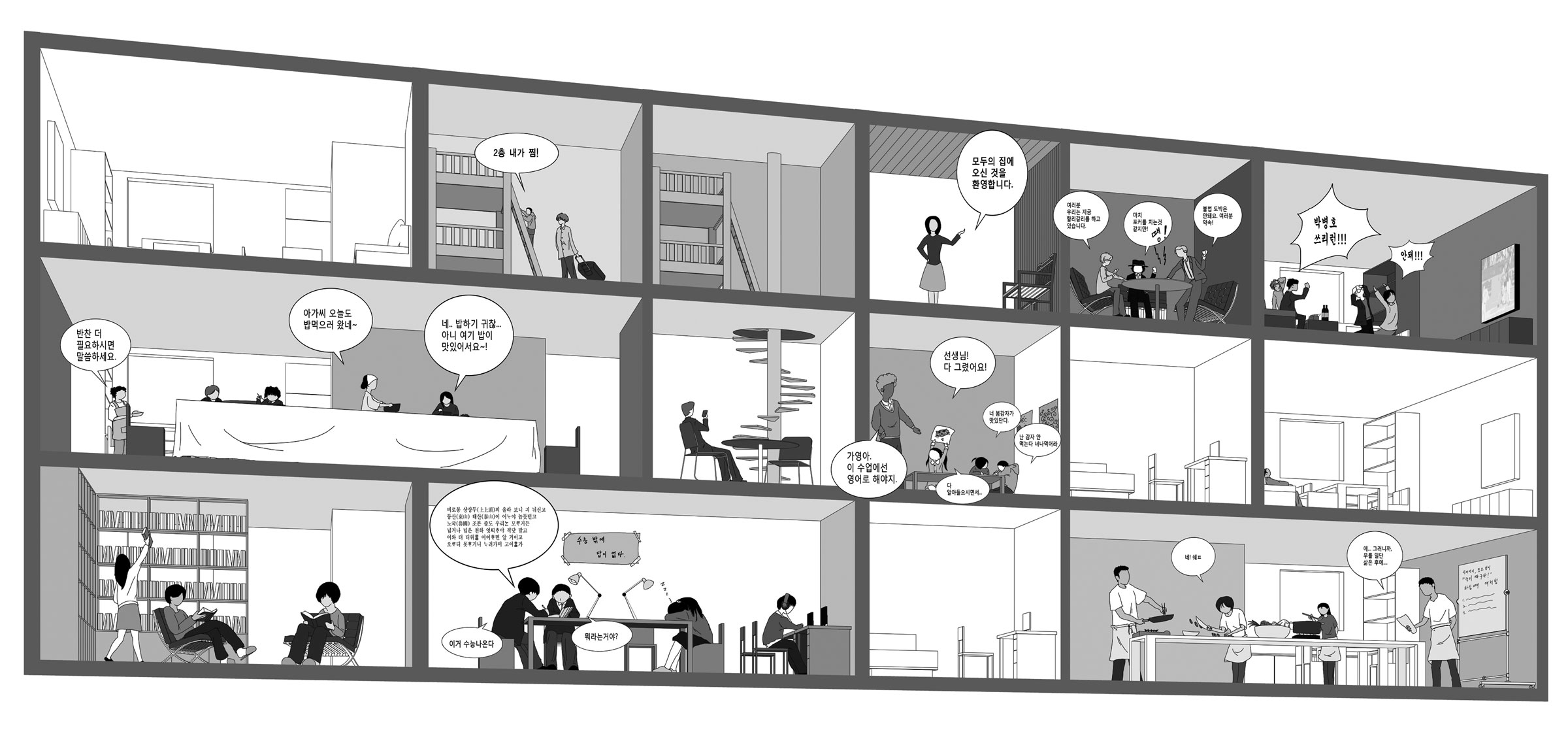 이진오: 저는 공유 프로그램을 외부에서 추가할 것이 아니라 기존의 아파트 내부 기능을 확장하고 그것들이 조금 느슨해지는 방향을 생각해봤습니다. 그래서 방, 거실, 부엌 모두가 기능을 확장하면 모두의 방, 모두의 거실, 모두의 부엌이 가능한 것이죠. 더 구체적인 예를 들어보면 방은 게스트하우스로, 거실은 공부방이나 어른들이 모이는 장소 혹은 살롱, 부엌은 요리 교실이나 레스토랑으로 쓰일 수 있는 거에요.