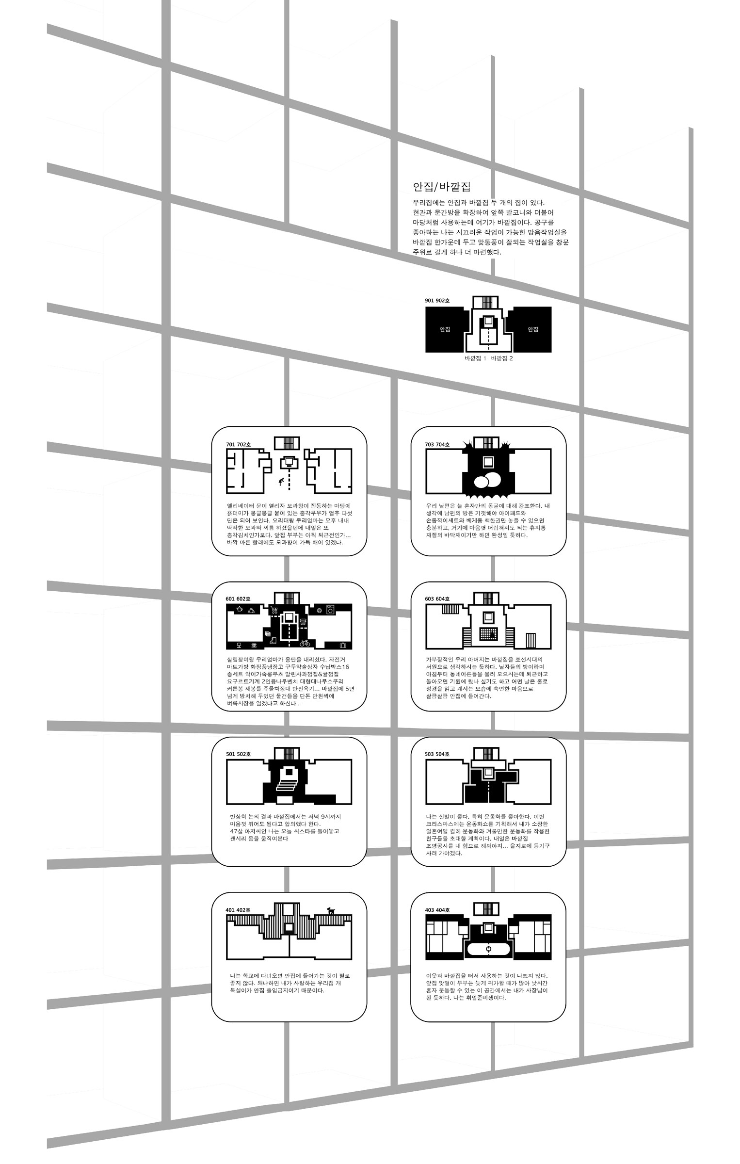 생활의 바탕을 이루는 오랜 습관은 삶의 반복되는 형식을 통해 공간의 문법을 만들고 사회적 제도와 법규로 정착된다. 반대로 제도와 법규가 바뀜으로써 오랜 삶의 형식과 습관이 바뀌기도 한다. 사적 공간 형식인 서양의 ‘룸’(room)과는 달리, 한국의 ‘방’은 사적, 공적 프로그램을 모두 수용한다. 우리의 작업은 주택법 개정을 통해 아파트 세대 간의 구획 방식이 완화되고 세대 내부에 공동시설을 설치, 운영할 수 있다는 가정하에 출발한다. LH공사 84㎡ 아파트 표준평면을 최소한만 변형하여 기존의 획일적인 공동체의 삶을 다원화하고, 오히려 아파트 구조이기 때문에 효과적으로 활용할 수 있는 공유 아이디어를 제안한다.