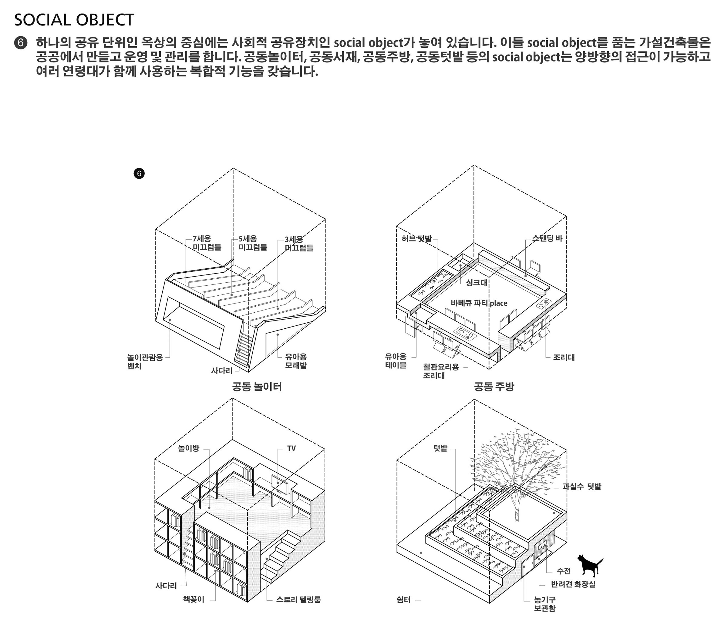 한편, 공유의 주체는 개인과 개인뿐만 아니라 개인과 사회, 개인과 공공일 수도 있다는 것이죠. 그리고 그 대상은 개인이 소유하고 있는 공간이 아니라 바로 사용 그 자체인 것이고요. 어떤 사용을 새로 만들어내고, 어떤 사용을 공유할 수 있는지에 관한 가치 체계인 것입니다. 그 사용을 사용자들이 어떻게 나눠 쓸 것인가에 대한 대안적 가능성을 보여주고 싶었습니다. 그 가능성은 우리가 매일 ‘공유’하면 떠오르는 공유 주택과 같은 스테레오 타입, 즉 조금씩 희생해서 우리끼리 나누는 것만이 아니라, 더 나가서 나와 시설 간의 공유, 시설과 시설 간의 공유 등의 형태일 수도 있고, 그것이 마을, 더 나아가 도시로 성장하여 공유 마을, 공유 도시일 수도 있다는 것을 말하고 싶었습니다. 온전히 혼자인 동시에 결코 혼자가 아니라는 사실이 삶에서 구현되는 공간을 꿈꿔볼 수 있어서 행복했습니다.
