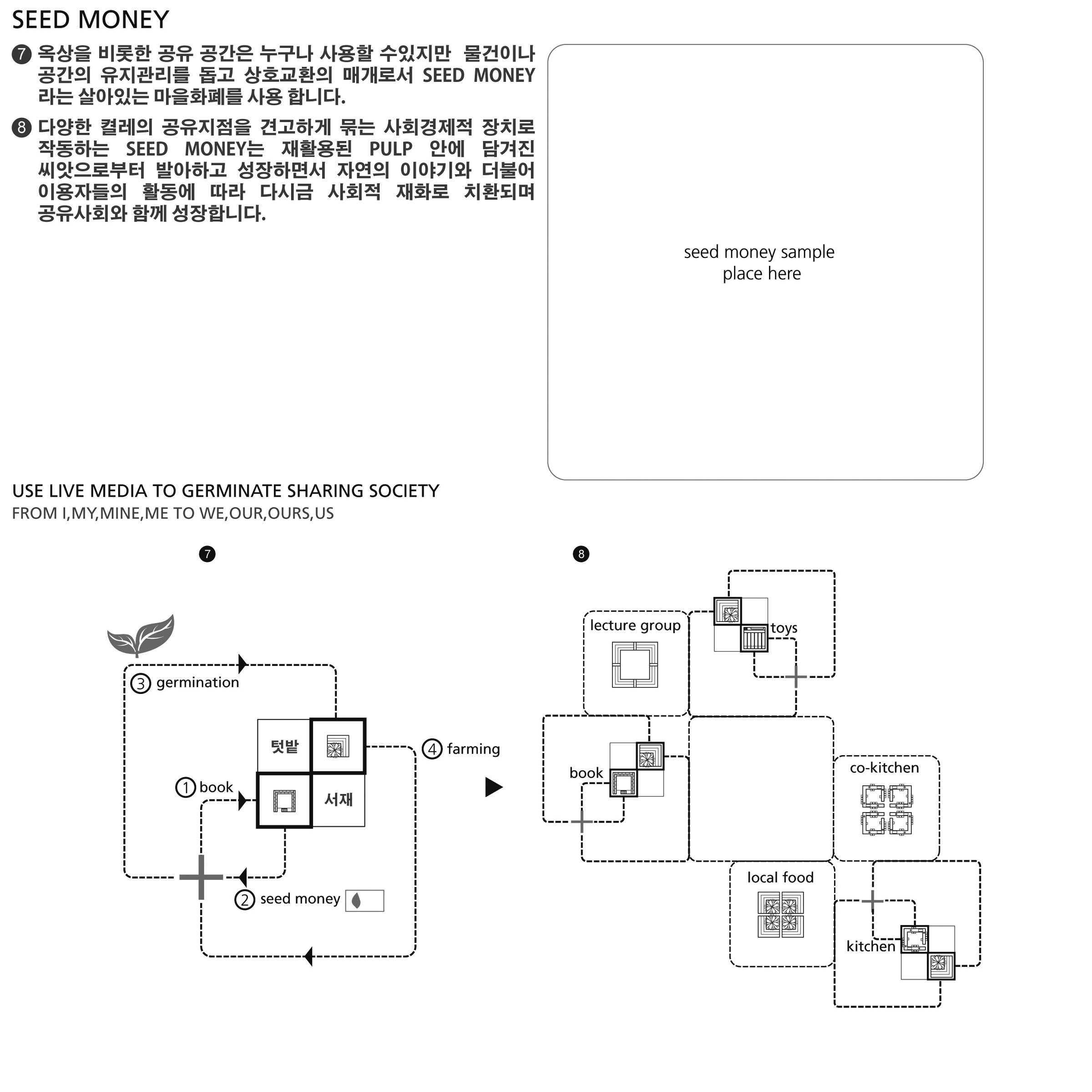 유승종: 조경가로 참여한 저는 이 작업이 공간이나 오브젝트를 만들기보다는 잘 조직된 시스템, 즉 엔트로피가 선한 방향으로 성장할 수 있는 체계를 생각했습니다. 그것을 ‘시드머니’라는 것으로 구체화했죠. 재활용 펄프에 여러 가지 씨앗들이 박혀 있는 상태에서 응고된 종잇조각이 바로 시드머니입니다. 이를테면, 도서관에 책을 기증한다거나 봉사활동을 한다거나 하면 공동체 안에서 가치가 교환되고 시드머니를 얻게 됩니다. 이것을 다시 자기 공간에서 개별적으로 성장시켜서 공동 텃밭으로 옮기거나 발아된 상태에서 공동 텃밭을 함께 조성할 수도 있고, 아니면 또 다른 교환 행위의 매개로 사용할 수도 있을 것입니다. 결국, 시드머니는 선한 행위의 발아라는 상징적인 의미의 연결고리일 수도 있겠지만, 공유라는 선한 행위, 나눔의 행위, 공동체 행위를 할수록 자연의 엔트로피도 함께 올라가고 또한 그것이 다른 공유의 네트워크 안으로 다시 성장해서 지속적으로 가치가 생산될 수 있는 시스템을 제안하고자 고안한 것입니다.