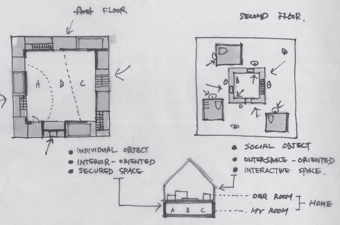 자, 집 안에 ‘내 방’ 하나가 있습니다. 그것이 집 밖의 ‘우리의 방’이라는 곳과 연결되는 이상한 생태계를 짜봅니다. 네트워크의 노드(node)가 집이 되고, 집은 나의 방과 우리의 방이 수직적으로 결합해 각각 고유 공간의 켜를 이루면서도 수평적으로 맞물려서 연결될 수 있습니다. 외부화된 방을 품은 집은 내밀한 방이라는 개념 대신에 도시화된 방, 즉 다른 사람들과 만날 수 있는 방의 가능성을 바라볼 수 있게 해줍니다. 사유와 공유가 씨줄과 날줄로 촘촘하게 맞물려 ‘우리 집인 동시에 내 도시’가 되는 새로운 가능성의 공간은 나와 우리의 경계를 유연하게 열면서 다양하게 구획하는 연결의 기술을 필요로 합니다.