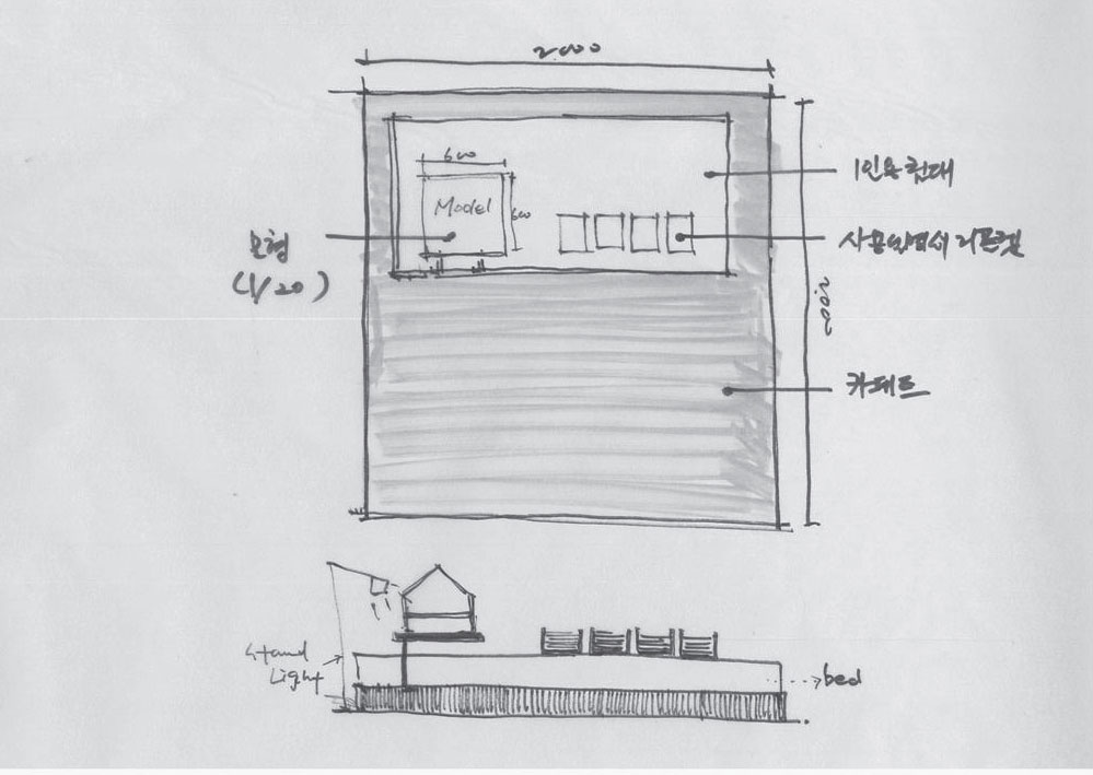 전시 시나리오에서도 옥상 공간과 유기적으로 엮여 있는 방들의 네트워크를 제안했습니다. 이것은 한마디로 옥상을 공유하는 프로젝트라고 말할 수도 있겠죠. 중요한 것은 이 옥상 공간은 연면적에 포함되지 않기 때문에 덤으로 주어진 공간이고, 여기에 온실과 같은 가설건축물을 공공이 만들어서 커뮤니티 공간으로 관리, 운영하는 방식입니다. 다시 말해서 개인은 자신의 공간을 잃을 필요 없이 커뮤니티 시설의 내용과 접근에 대한 사용가치를 얻는 것이고 공공은 토지나 공사비의 부담 없이 실질적인 지원을 해줄 가능성을 보여주고 싶었습니다. 물론 이 공유 공간은 개인의 구체적인 요구와 참여로 기획되어야 하지만, 운영주체는 공공이 되어야 할 겁니다.