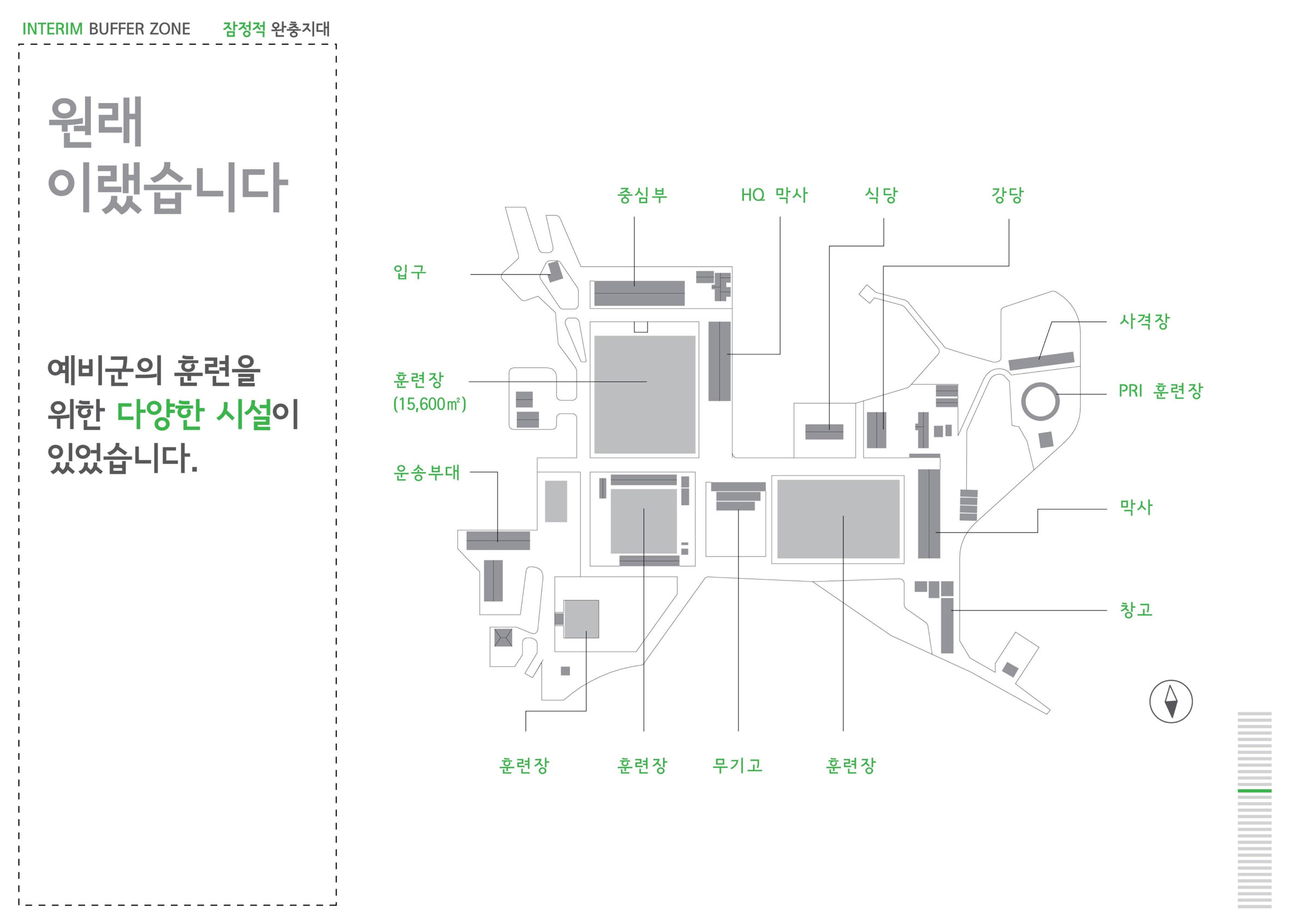 ‘잠정적 완충지대’는 이 예비군 훈련장 가운데 하나를 임의로 선정하여 군사훈련을 목적으로 조성한 예비군 훈련장의 공간 구조와 내부 시설들이 어떻게 탈북민의 임시 거처로 활용될 수 있는지에 대한 방법을 제안한다. 작게는 탈북민이 생활하는 단위 공간에 대한 고민에서부터, 크게는 제한된 시설 안에서 공동체 생활이 원활히 유지될 수 있게 하는 제도와 프로그램을 구성하려 한다. 더 나아가 예비군 훈련장이 탈북민의 임시 거처로 이용되는 기간과 그 이후의 주변 지역사회와의 다양한 상호 영향 문제를 고민한다. 이를 통해 군사시설인 예비군 훈련장이 전혀 다른 체제에서 살아온 사람들에게 앞으로 전개될 새로운 삶을 준비하게 해주는 공간이자, 탈북민과 기존 거주자의 안전한 공존을 꾀할 수 있는 완충지대가 될 수 있음을 보여주고자 한다.