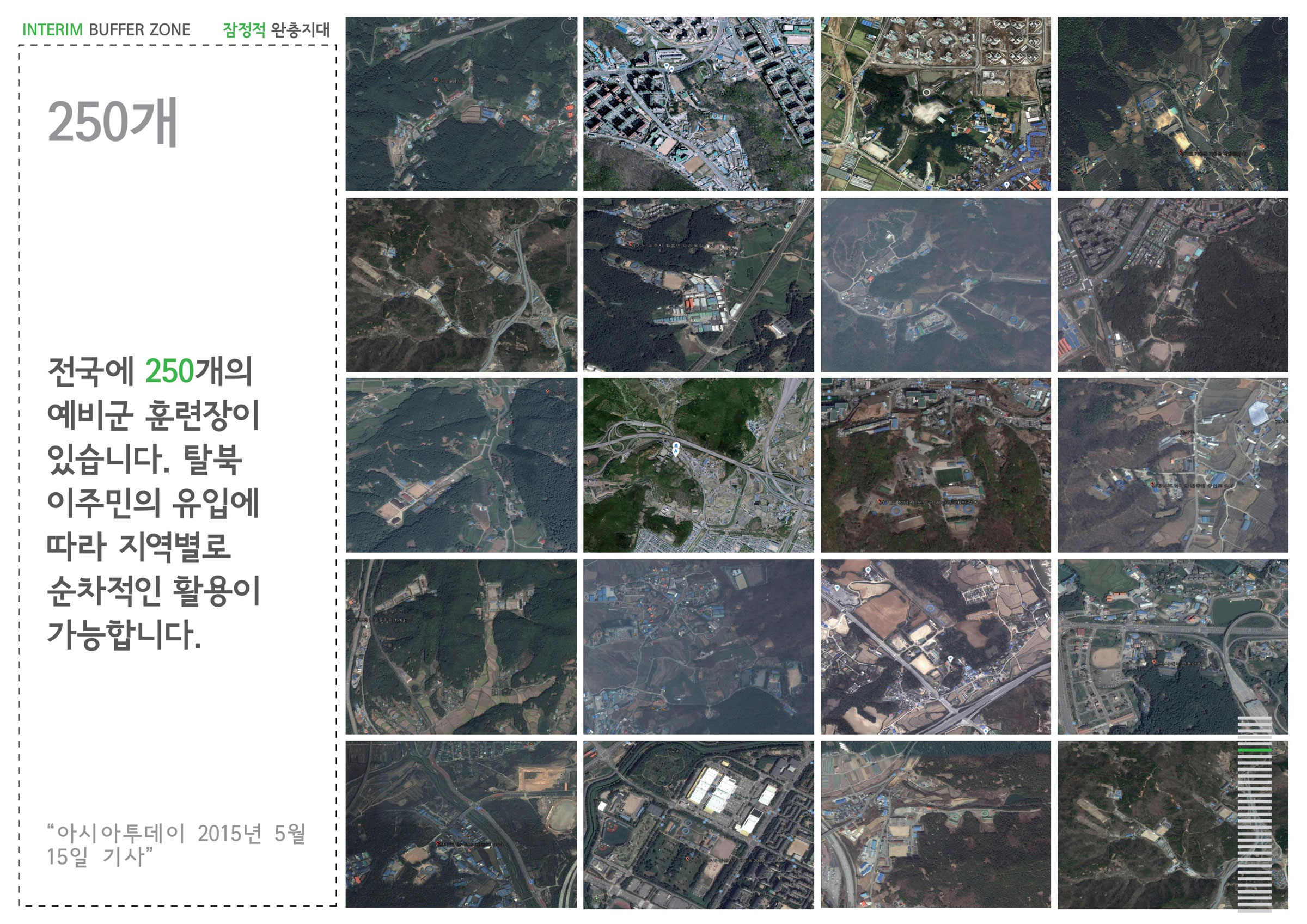 황두진 우리 작업의 제목은 ‘완충지대’(Buffer Zone)에 ‘잠정적’(Interim)을 더한 ‘잠정적 완충지대’(The Interim Buffer Zone)이다. 우리가 가정한 것은 한반도에 유동적인 상황이 발생했을 때 대규모 탈북이 일어날 수 있다는 것이었다. 그러한 경우 우리 사회가 이들을 위한 임시 거처를 만들어줄 수 있을까? 매우 심각한 상황이 벌어질 가능성도 있다. 난민과 관련해서는 인권 이슈도 있지만, 우리가 현실적으로 감당할 수 있고 수행할 수 있는 사회의 능력에 관한 두 가지 문제 속에서 고민해야 한다고 보고, 양욱 선생과 협업하기로 했다. 우선 전국에 있는 약 250여 개의 예비군훈련장이 이 가정 상황의 용도에 적합하지 않을까 했다. 그 과정에서 UN이나 전 세계 군사 기관들이 재정의해놓은 난민 시설의 기준을 참고했다. 국제적으로 통용되는 기준을 근거로 하되, 한국의 특수성도 감안해 전·후 한국 사회에 미칠 수 있는 부정적 영향을 최소화하고 대량 탈북자에게는 부드러운 방식으로 대한민국 사회에 연착륙 할 수 있게 하는 시나리오를 생각했다. 본래 군사시설이던 것을 평화를 위해 사용한다는 역설이 발생할 수도 있다. 이것이 우리가 생각하는 프로젝트의 주된 내용이다.
