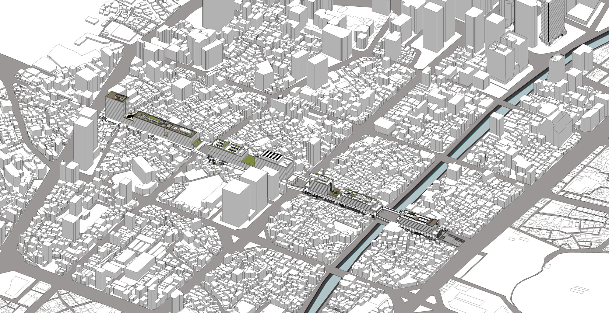 셋째, 이미 심의나 허가가 진행 중인 사업 지역의 경우에는 사업 시행으로 인하여 세운상가 공공영역이 고립되거나 통경축이 가려지는 문제를 해결할 수 있도록 — 세운상가와 연결된 새로운 공공영역을 새로 개발되는 건물의 중간층 혹은 최상부층에 마련함으로써 세운상가에서 시작된 공공영역이 주변 재개발 지역으로 확장될 수 있도록 — 적극적으로 유도한다.