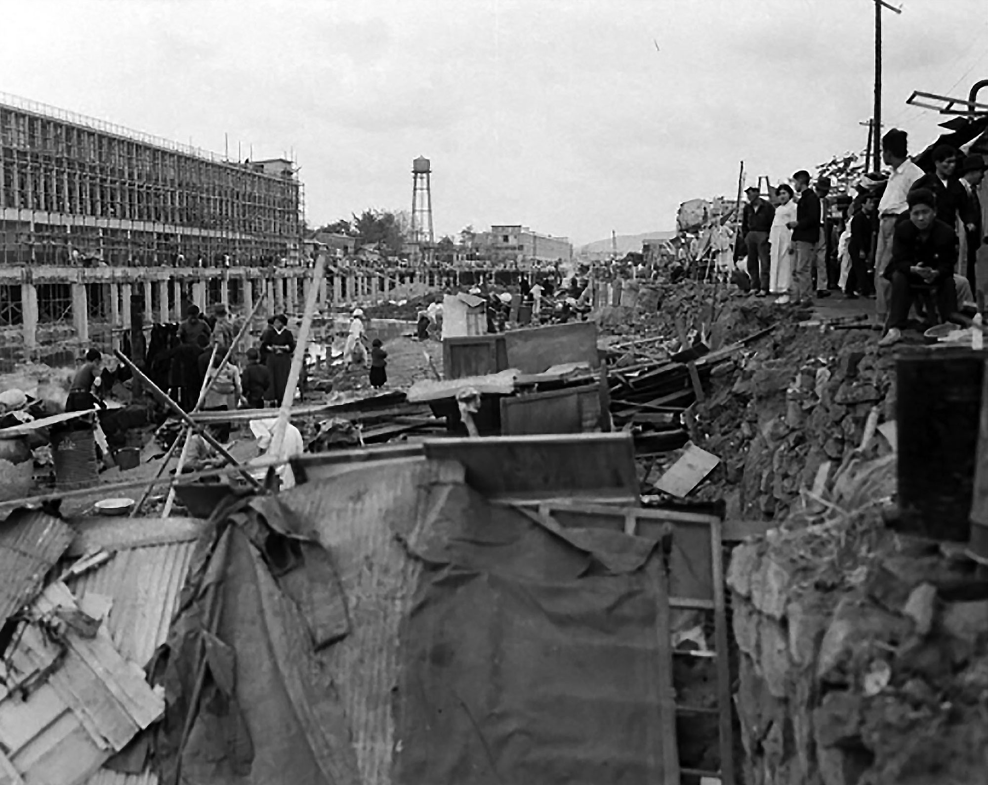 세운상가의 구상은 도심지와 주변 공간을 개인의 땅이기 이전에 국토의 일부분으로 다루는 1960년대 도시계획의 단면을 보여준다.15 이로써 도시는 테크노크라트의 조율 아래 계획하고 건설하는 수정 가능한 대상이 됐지만, 아무리 강력한 독재정권의 도심 개발 프로젝트라 할지라도 기존 도시를 백지화한 상태에서 시작할 수는 없었다. 세운상가를 계획한 대지는 한국전쟁 이후 피난민 판자촌이었다. 식민지 시기 종묘에서 필동 구간의 소개공지(疏開空地)는 한국전쟁과 전후 혼란을 거치며, 국유지와 사유지가 뒤섞여 있었다. 초기부터 종묘 앞 종삼과 인현 일대를 세운상가 아파트 계획으로 묶어 대규모 재개발사업으로 함께 진행하고자 했고, 네 개 블록을 묶어 재개발하기 위해서 무엇보다도 복잡한 토지 소유 관계를 정리하는 게 중요했다. 한국종합기술개발공사의 김수근 팀 역시 이 문제를 강조했다. 그들은 기존 지역이 도로와 시장 공간 문제로 인해 슬럼화를 겪고 있으며, 도로율이 작은 데 견줘 상가가 지상층에 많은 점이 과도한 교통량을 발생시켜 도시 주거환경으로 좋을 수 없는 구조라고 평가했다. 또한 그들은 ‘적절한 도시적 질서 부여를 통해 기존 거주 집단이 도시에 적응하는 재개발이 가능하다’고 봤고, 이 논리는 재개발의 당위성을 제공했다. 재개발 계획은 도로를 넓히고 주차장을 만드는 하부구조의 문제에서부터 기존 도시 거주민의 이동에 대한 것이었다. 그들은 기존 2489동의 단층 고옥을 종묘의 13층 연립주택과 남산의 초고층 아파트군으로 이전하고, 종묘에서 남산까지 지역을 보행데크로 연결하고자 했다.16 이렇게 만들어진 보행로와 건물군은 거대한 선형의 볼륨으로 ‘도시(구성)의 강력한 시각적 질서’를 보여주는 상징이었다. 요컨대 건축가에게 인공대지는 ‘종묘를 새로운 도심으로 부각시키는’ 도시 중심 공원으로 만드는 동시에, 이동한 기존 거주민이 새로운 상가 공간을 이용하도록 연결하는 재개발 계획의 중심 개념이 됐다.