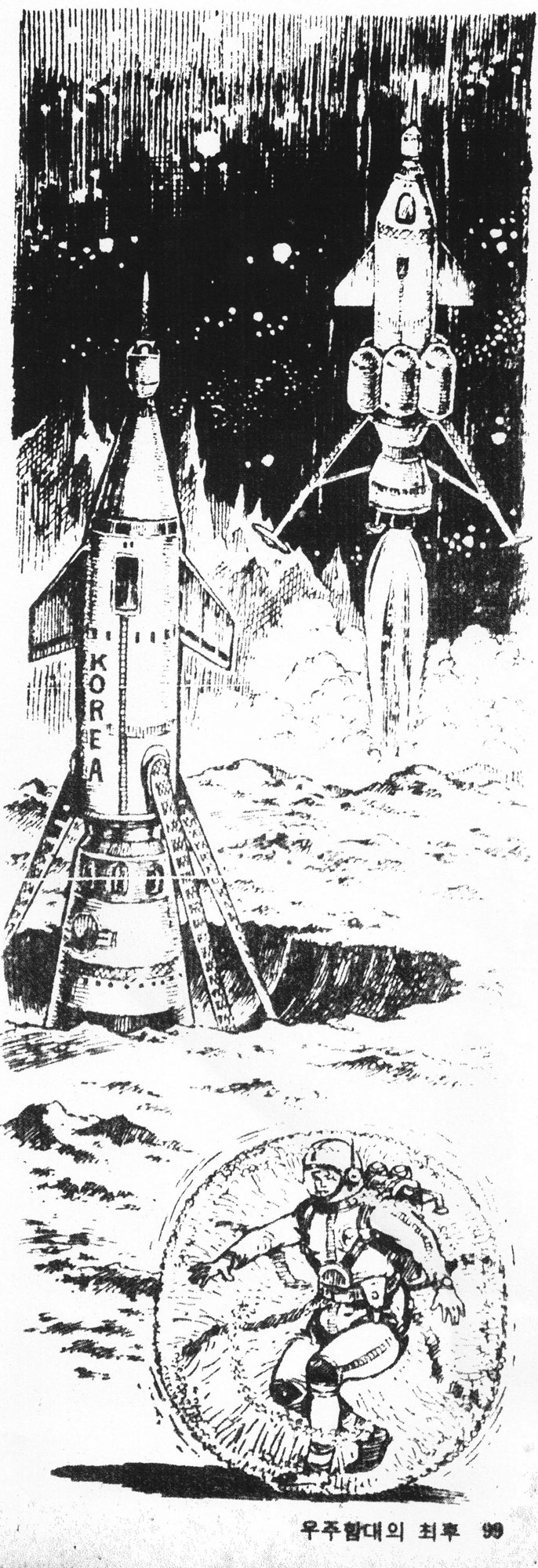 이 잡지에서 전개된 ‘과학’의 개념과 서사는 언제나 냉전 반공주의, 국가주의, 민족주의 이데올로기에 얽혀 배치됐다. ‘이런 과학’의 창달(暢達)에 힘을 보태는 일엔 『학생과학』에 연재된 수 편의 한국산 SF소설도 예외가 아니었다. 이를테면 서광운의 『우주함대의 최후』(1969년 연재)에서 이만석 박사는 우주여행의 역사적인 대의를 성공리에 완수하기 위해 성욕 따윈 참아야 한다고 대원들을 다그치고13, 로켓에 오르기에 앞서 조국 동포에 바치는 눈물의 편지를 쓴다. “사랑하는 조국이여, 그리고 동포들이여 우리는 기어이 성공할 것을 맹세합니다. 그러나 우주 공간에는 갖가지 마력이 숨어 있을 것으로 압니다. 밤하늘에 은하수가 반짝거리는 것을 보면서 한국 원정대의 안전을 빌어주십쇼. 우리는 늘 동포의 뜨거운 성원이 있는 것으로 믿고 떠나겠습니다. 안녕히 계십쇼.”14 이 시기 한국인들은 이와 비슷한 목소리와 정조(情調)를 월남 파병 용사, 파독 간호사와 광부, 그리고 중동 근로자로부터 되풀이해 듣게 된다. 1960년대 남한 사회의 SF적 상상력은 당대 사회 문화적 한계를 넘어서려는 욕망이 아니었다. 오히려 그 한계성을 키치적으로 폭로하는 만성 결핍증이었다.