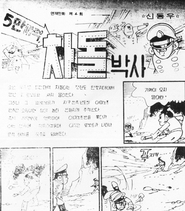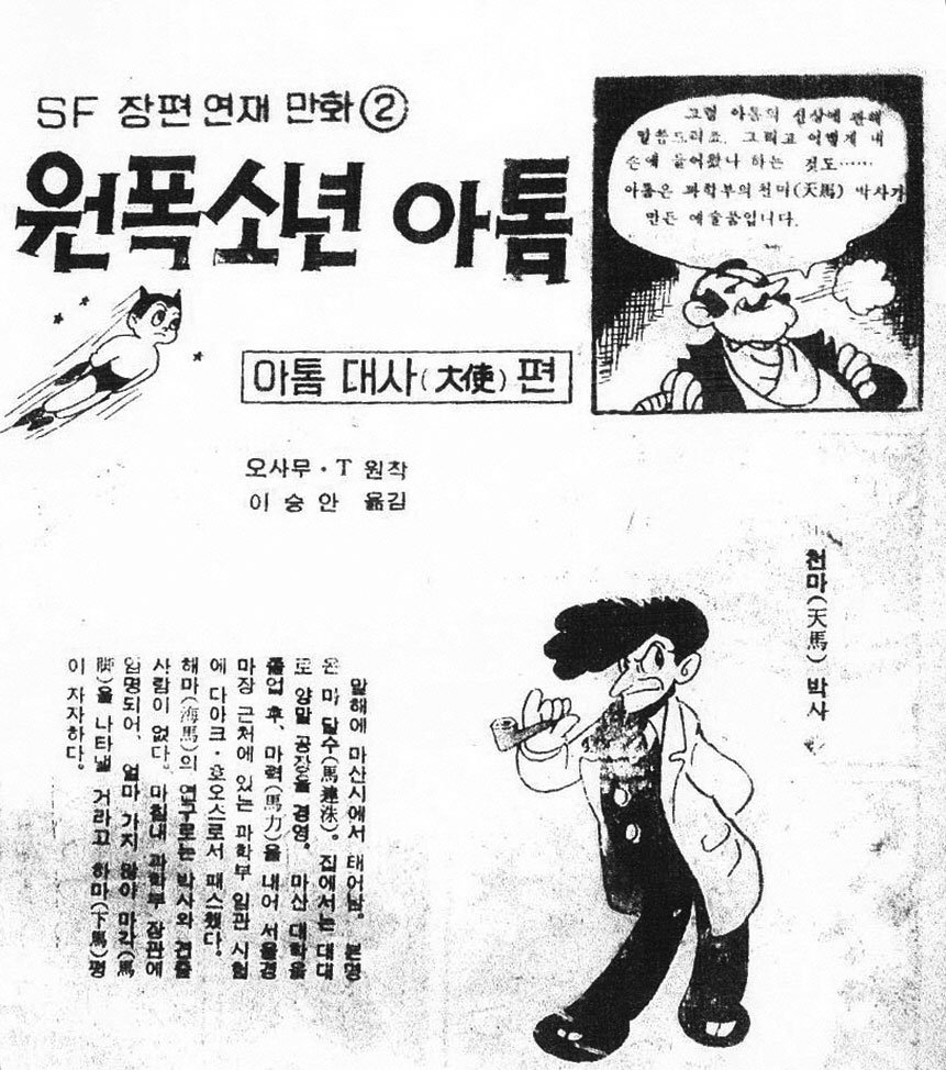 『학생과학』에 소재(所在)한 만화와 관련해 또 하나 빼놓을 수 없는 사실은, 데즈카 오사무의 『철완 아톰』이 「원폭소년 아톰」이란 제목으로 — 이 역시 라이선스 계약을 맺지 않은 무단 전재였지만 — 국내에 최초로 소개됐다는 것이다. 연재가 시작된 1966년 7월은 일본 후지TV에서 『철완 아톰』의 TV애니메이션 시리즈가 막 종영될 무렵이었다. 그리고 앞에서 소개한 신동우의 「5만 마력 차돌박사」는 아톰의 영향이 적잖게 배어 있는 작품이기도 했다.