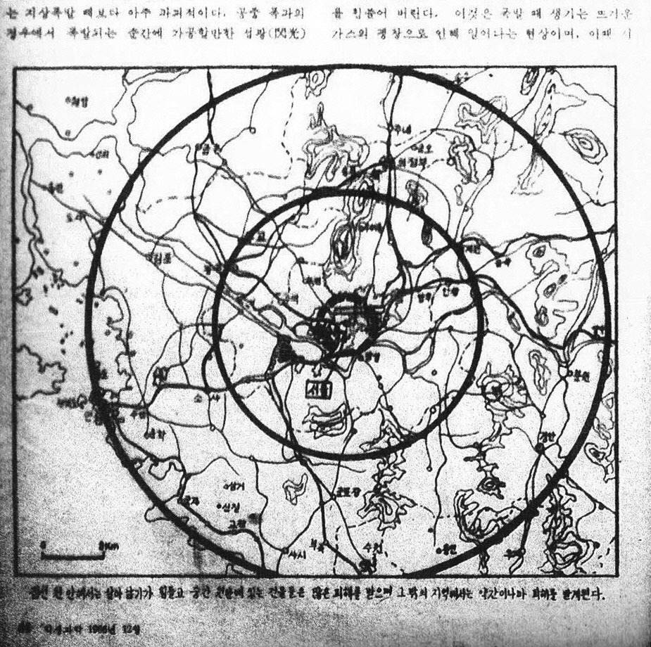 『학생과학』은 핵무기에 대한 공포와 원자력의 평화적 이용에 관한 이야기를 함께 다룬 매체였다. 「남대문 상공에 원자폭탄이 떨어진다면?」(1966년 12월호)에서는 서울시 지도를 동원해 구체적인 피해 반경을 설명한다. “원자폭탄이 떨어져 폭발하면 1.2km 떨어진 용산의 어느 곳에 있든지 살아남는 비율은 반반보다 적다. 폭탄이 폭발하는 지점 바로 아래에만 있지 않았다면 땅속에 있는 경우가 살아남는 확률이 높아진다. 그리고 폭발 지점에서 800m 이내는 거의 완전에 가까운 황폐를 가져오게 된다. 0.8km에서 1.6km 범위의 콘크리트나 철근 건물은 부서지지 않고 서 있게 된다. 그 이내 지역 건물들은 내부가 완전파괴가 되어 버린다.”23 이와는 반대로 「제2의 불, 원자력의 발견과 이용」(1968년 4월호)에선 원자력의 평화적 이용이 가져올 이로움을 역설한다. 핵무기는 인류를 위협하는 공포의 대상이지만, 핵발전은 쾌적하고 편리한 미래를 위한 기술이라는 바보 같은 이분법. 『학생과학』은 끝없이 ‘핵’을 동어반복 하는 프레임의 전형을 보여준다. 바로 이 프레임에서 냉전 이데올로기의 온갖 억압적 기제와 핵 자본주의의 알파와 오메가가 모두 작동된다. 그러나 안타깝게도 이 프레임을 꿰뚫을 수 있는 불온한 SF적 상상력은 1960년대 남한 사회에 부재했다.