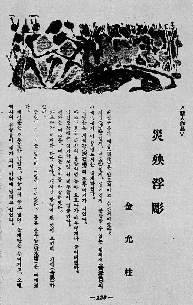 그러나 심사위원들의 바람과 달리, 1960년대의 첫번째 겨울을 앞두고 발표된 「재앙부조」는 필연적으로 이런 결말에 다다를 수밖에 없었던 것은 아닐까. 그렇다면 이것은 김이석이 평하듯 다루기 벅찬 소재에서 생기는 문제가 아니다. 오히려 혁명도 미완, 민주주의도 미완, 전후의 재건도 미완인 현실에서 그 모든 만연한 결핍을 반영하는 증환(症幻)을 이 작품이 그대로 앓고 있다고 진단할 수 있다. 그리고 이런 해석에 따른다면 심사위원들이 꼬집은 그 대목이야말로 다가올 1960년대의 사회 문화적 현상을 꿰뚫어볼 수 있는 가장 적나라한 지점이 아니었을까.