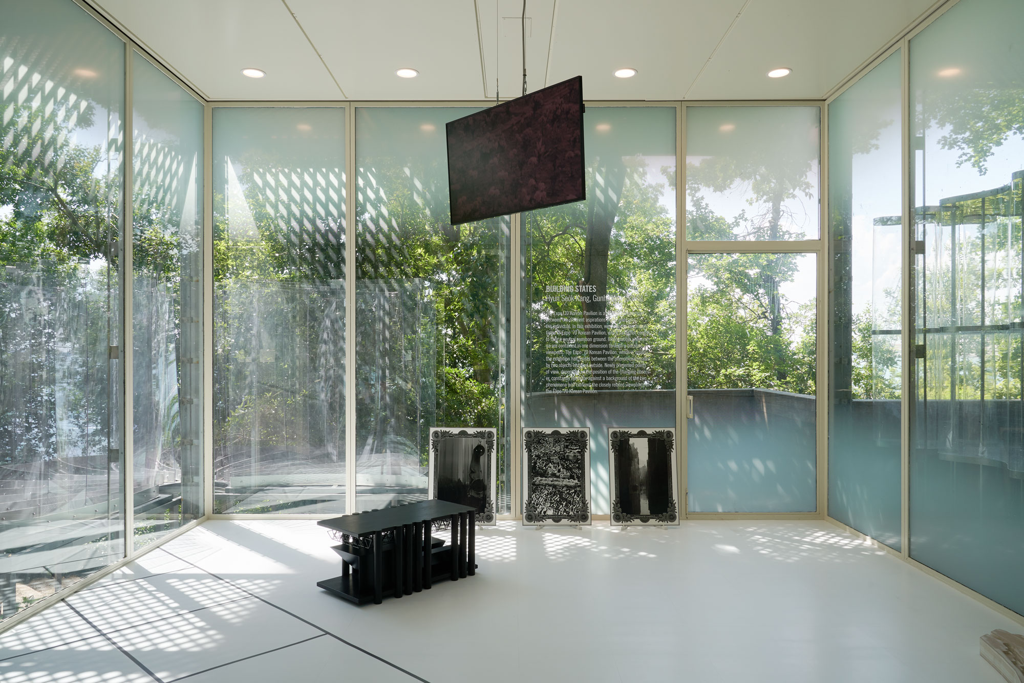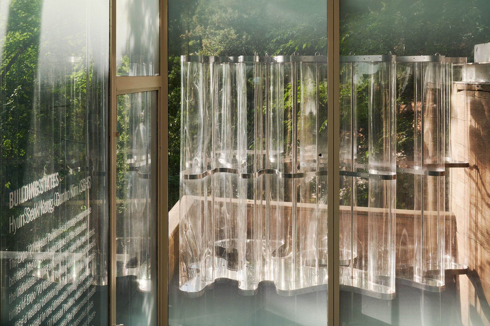 엑스포70 한국관 모형을 의자 삼아 앉으면 전시 공간은 공감각적 경험의 차원에 놓이게 된다. 복각된 강석희 선생의 전자음악을 배경으로, 한국종합기술개발공사의 건축가들이 의도했던 경계가 개방 · 확장되면서 주변의 모든 것들이 건축화하는 공간과, 내러티브 없이 분위기와 무드만이 존재하는 미래 전시실의 해프닝적 환경이 복구된다. 전시관 외부에 설치된 오브젝트들은 국가관 내부에 속하지는 않지만 국가관의 연장 또는 거기에 기생하며 존재하는 제3의 공간이다. 이들은 국가관의 경계적 제약을 극복하고 정신적 신체적 가능성을 무한히 확산하려 하지만, 국가관 가장자리에서 드러나듯 국가관이 개인에게 기회이자 동시에 한계가 되는 역설적 상황을 자아낸다. 겹쳐지고 휘어진 종잇장과 부풀어 오른 비누 거품을 닮은 투명한 장치가 만들어내는 직선과 곡선의 비물질적 공간은 끊임없이 수렴하는 동시에 끝없이 발산하는 공간이다. 전시관 내부와 자연환경의 우연한 변화는 부드러운 반사와 확산을 통해 주변 공간을 다채롭게 변화시킨다.
